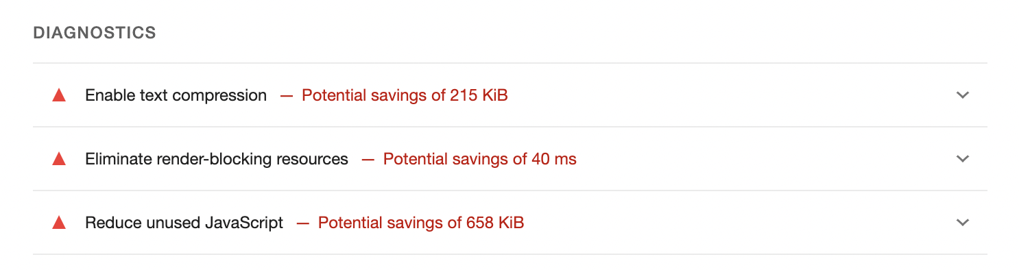 کمی پایینتر، یه لیست از پیشنهادها میبینیم که میتونن بهمون کمک کنن امتیاز عملکرد رو بهتر کنیم — مثلاً کاهش حجم تصاویر، بهینهسازی فونتها، حذف جاوااسکریپتهای اضافی و غیره.
