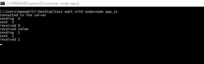 همانطور که میبینید برنامه پس از اتصال به brocker عدد 0 رو فرستاد و چون خودشم هم publish میکنه و هم subscribe پس مقدار 0 رو دریافت هم میکنه .