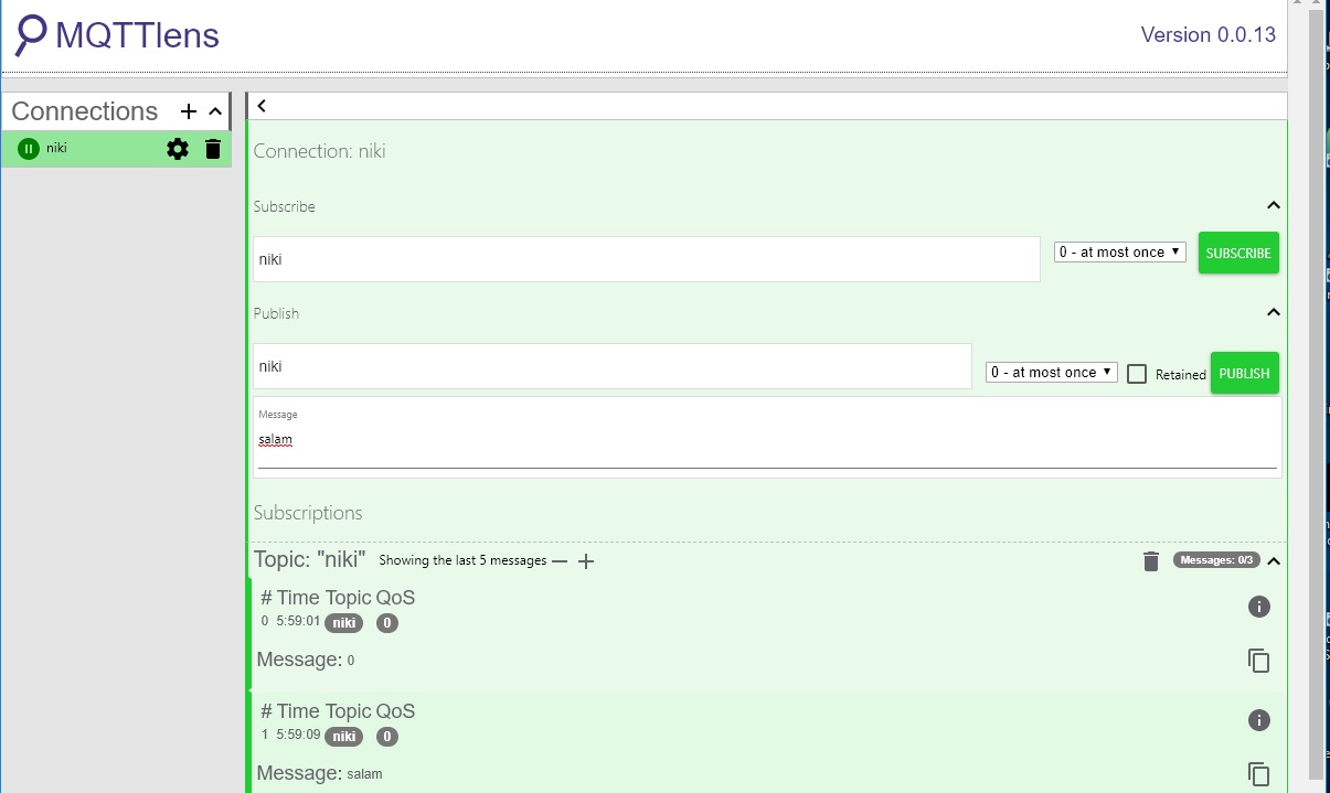 خب این رو هم بگم که برنامه ما به topic ای با نام niki وصل میشه.و کدهای بالا هر یک ثانیه یک بار یک مقدار عددی رو publish میکنند.