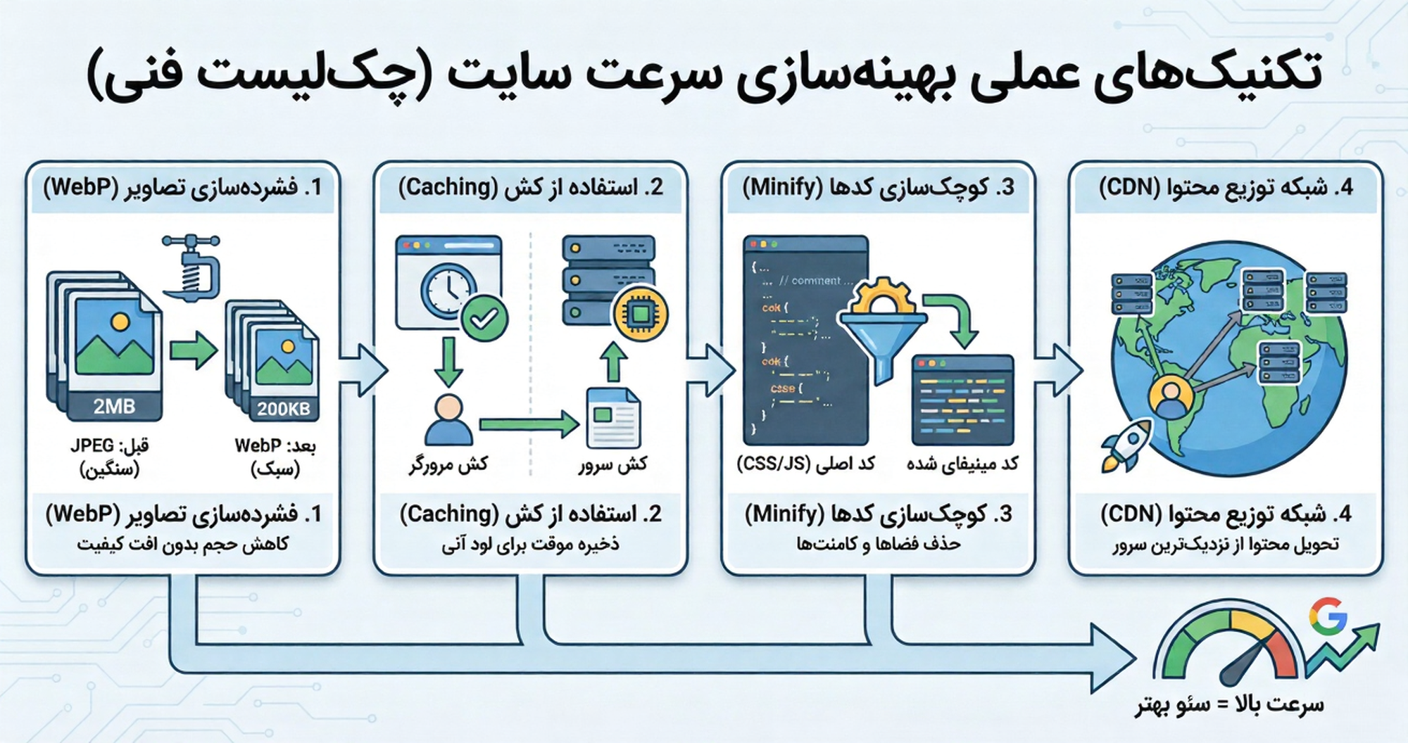 حالا که مشکلات را پیدا کردیم، نوبت به «جراحی» سایت میرسد. در این بخش از تئوری فاصله میگیریم و وارد فاز اجرایی میشویم. تکنیکهای زیر، موثرترین روشهایی هستند که میتوانند در کمترین زمان، نمره Core Web Vitals شما را از قرمز به سبز تبدیل کنند. این موارد را به عنوان یک چکلیست اجرایی در نظر بگیرید که هر مدیر سایتی باید تیک بزند.