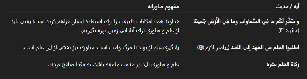 اگر فناوری بر پایه ارزشهایی مانند عدالت، صداقت، قناعت و مسئولیتپذیری اجتماعی توسعه یابد، منجر به پیشرفت واقعی جامعه میشود — نه تقلید صرف از غرب.