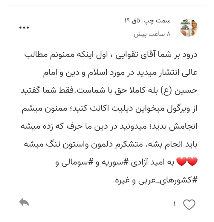 دوستی در پست قبل کامنت نوشته بود چی شد تو می گفتی دیلیت اکانت می کنم چرا باز پست می نویسی دیدم راست می گوید با مرام انسانی و دینی جور نیست که وعده بدهی و عمل نکنی دقیقا مثل خیلی از مسئولان ما طرف قبل از انتخابات می گوید اگر رئیس شوم خودرو گران شود گردن را گرو می گذارم که استعفا می دهم ولی خودش ماشین را چند برابر می کند.واقعا چرا چون برای من یک اکانت ویرگول ارزش دارد چرا چند ماه است با دیگران تعامل داشتم دوستانی دارم حتی یکی از آنها برایم در ایتا پیام می گذارد تلفنی با هم صحبت می کنیم وقتی پست هامو لایک می کنند احساس خوب می گیرم بدون تعارف از ابراز محبتاشون حتی آنهایی که صد در صد با هم اختلاف نظر داریم لذت می برم خلاصه دلبستگی ایجاد شده و درثانی نوشته هایی که نوشتم وحالا مثل یک تکه از وجودم من است از دستم می رود پس متاسفانه خلف وعده می کنم این آقا درست می گویددر سیاست هم افراد وقتی پست و قدرتی می گیرند وعده هایشان قربانی مقتضیات دلبستگی های آنها می شود و آنجاست که دلبستگی به قدرت فراموشکارشان می کند خیلی از ما دچار فراموشی قول هایی که داده ایم می شویم چون دلبستگی هایمان شیرین تر است .بله دوستمان راست گفت ولی .....عذرخواهی می کنم نمی توانم بله یکی از دلایل خون های امروز هم این است گفتند الوعده وفا که نکردند متاسفانه عذرخواهی هم نکردم.
