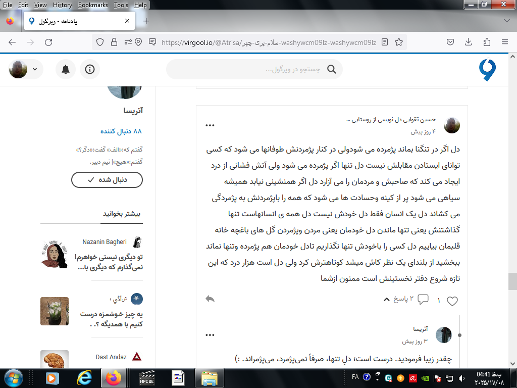 میدونید دوستان عزیز حقیقتش ویرگول برای من یک یک محله شده که آدماش همه یک نوشته خونه دارندآدماش مشغول زندگیشون هستند که نوشتنشونه بعضی وقتها به نوشته خونه های هم سر می زنن از گل واژه های گلدون باغچه نوشته خونه دیدن می کنند بعضی وقتها از گل واژه لذت می برند بعضی وقتا هم گل واژه ها مورد پسندشان نیست خلاصه فهمیدم نه ویرگول نه حتی اینستاگرام نه حتی کل فضای مجازی ونه حتی فضای حقیقی ونه حقیقی ونه مجازی روی هم ونه حتی کرده زمین همه عالم است حتی آسمونا هم همه دنیا نیست پس بهتر بگیم
