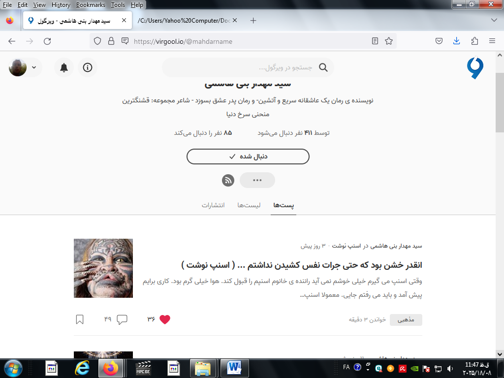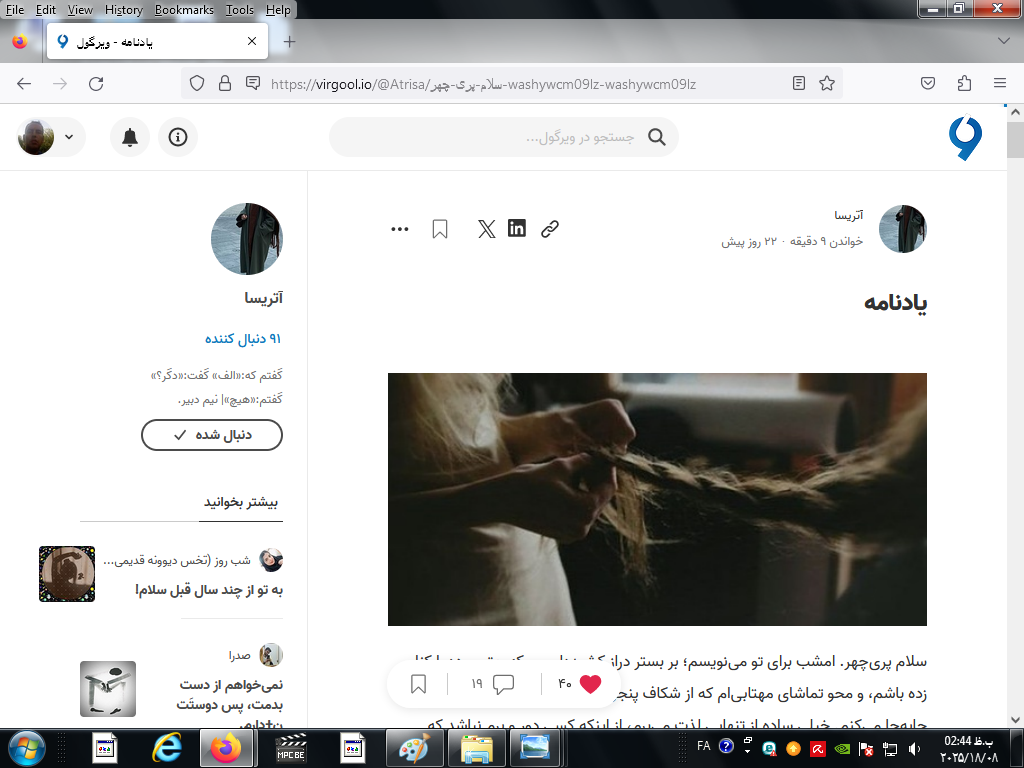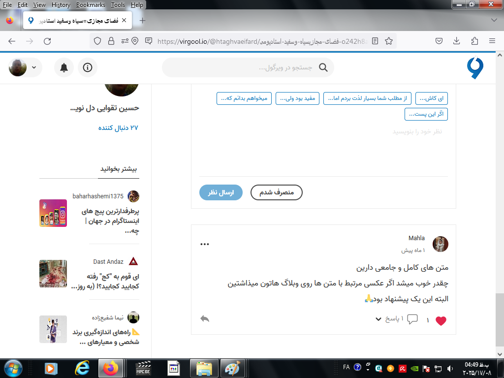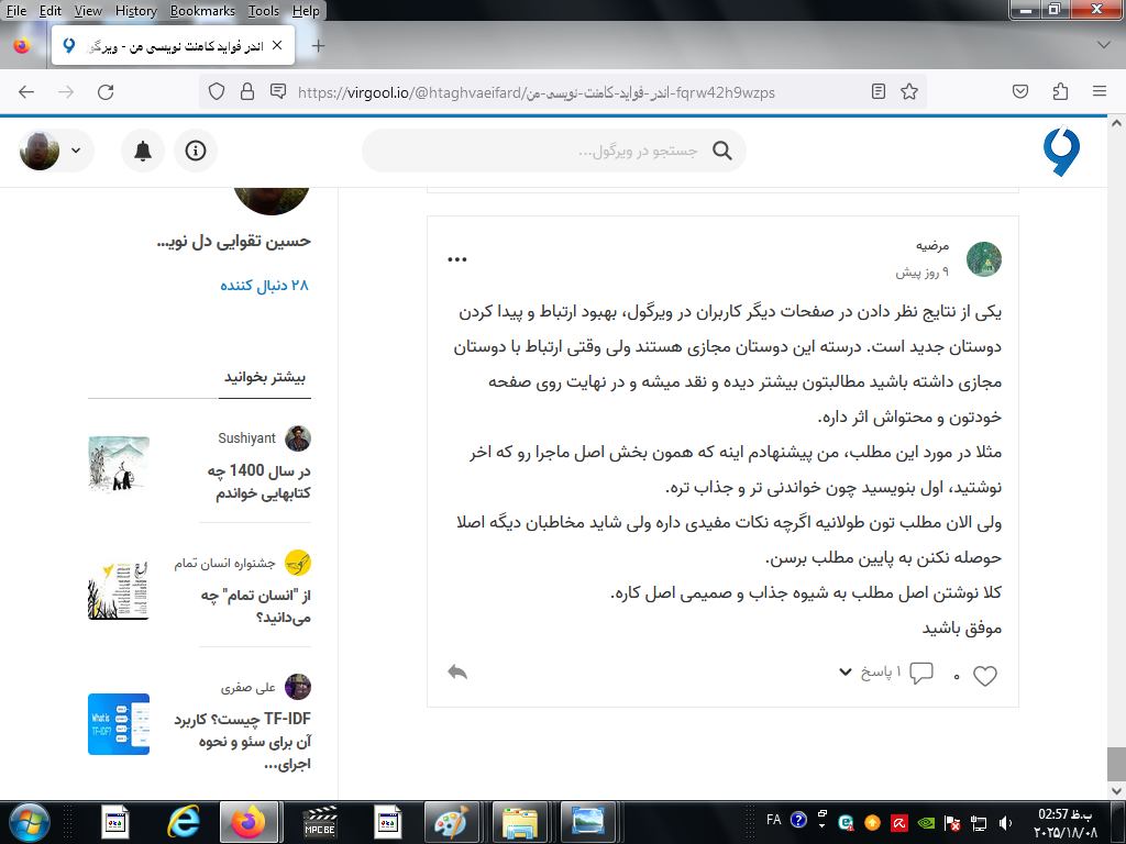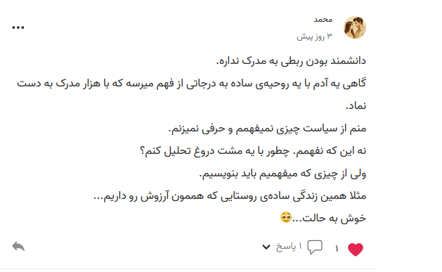 تا یک روز سایت ویرگول دیدم که یک حساب ایجاد کردم 3 تا پست نوشتم بعد ش ازمهر پارسال دیگه قلمم به خواب زمستونی رفت تا تیرماه یک روز وقتی مرورگر گوشی روبازکردم دیدم حساب ویرگول هنوز داره چشمک میزنه گفتم برم دوتا پست بذارم تا خدا چی بخواد از اونموقع 50 تا چندتا بیشترپست گذاشتم هرچند 10پست من شاید اندازه یک دونه پسته آقای بنی هاشمی که در مورد تولدشون نوشته بودند نشه .27 از بزرگواران چشمان مبارکشون برنوشته های سردرگم ما نظاره می کنه و91 نفر از نویسنده های عزیز را با دیدن مطالب ارزشمندشون دنبال می کنم سعی کردم کامنت ها زیادی بذارم هرچند بعضی از بزرگواران که کم لطفی کردند نگاهی هم به مطالب ناقابل مانکردند درصورتی همه مقاله هاشون خوندم لایکم کردم کامنتم هم گذاشتم به شوخی میگم ما رابه لایک توکه امید نیست کامنت مخالفی بنویس تا خوشحالمان کنی .
