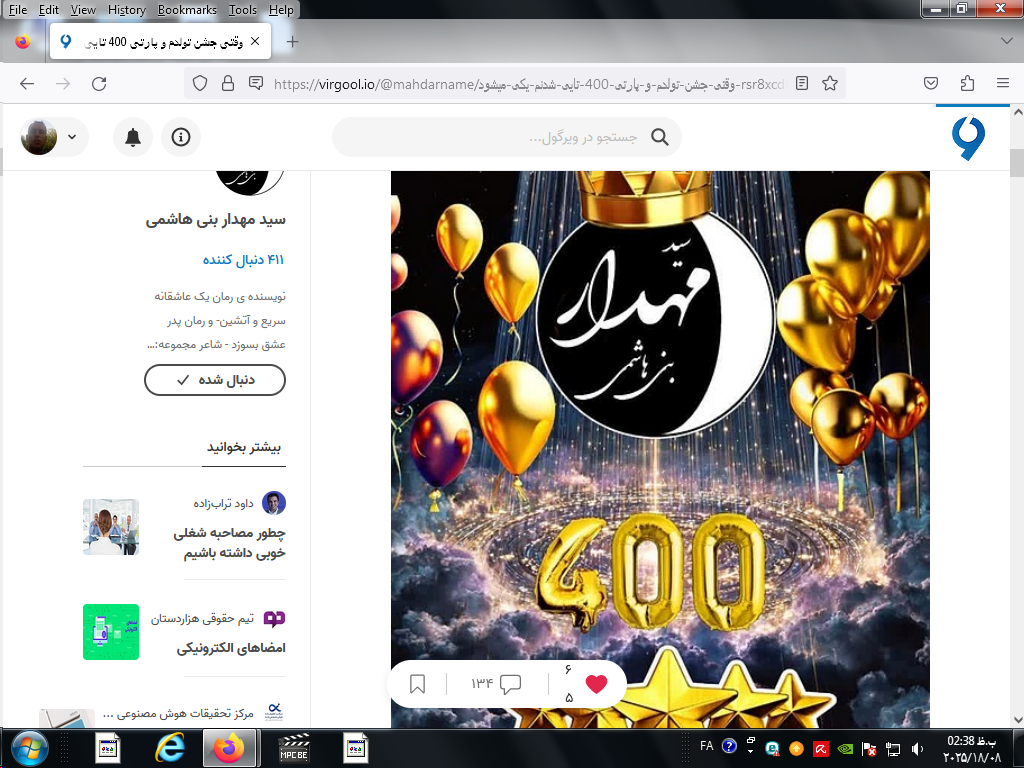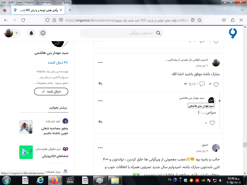 در ثانی، پارتی ۴۰۰ نفره گرفتی. چرا فقط سوگولیهای ویرگول باید کیک نوشته بدی؟ بار ۴۰۰ تایی شدنتو400نفر بکشن. به چند نفرسوگلی گوشچشم بندازی، عیب نداره. ولی ما هم دنبال کردیم، ما راضی نیستیم.تولد تو تبریک گفتیم فقط گفتی یک سپاس همین وتمام