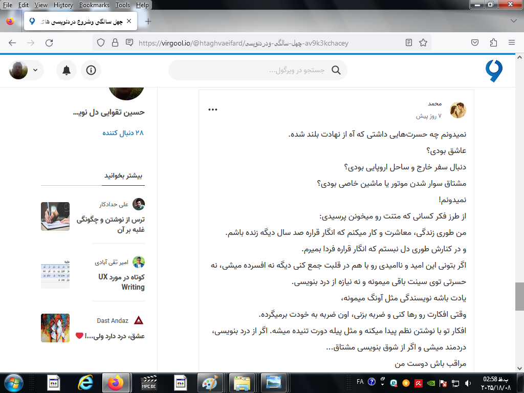 یه مقاله دیگه از ایشون به نام نزدیک به چهل سالگی خواندم یک دفعه داغ دلم تازه شد. گفتم: حسین، تو هم داره ۴۰ سالت میشه، سروصورت داره رنگ برف میگیره. فوری دست به کار شدم. یک کامنت به آقای دادخواه زدم، گفتم: داغ دلم تازه کردی آقای دادخواه، باید بذاری یه مقاله بنویسم. گفت: بنویس، ما هم میخونیم. نشستم مقاله ۴۰ سالگی شروع دردنویسی نوشتم. یک دفعه دیدم ویرگول برداشته اون مصیبتنامه رو گذاشته تو پستهای منتخب. گفتم: اگه میخواستی تو پستهای منتخبت ازمن یکیشو بذاری ، آبروداری میکردی، یکم شادترش میکردی به قول جواد یساری