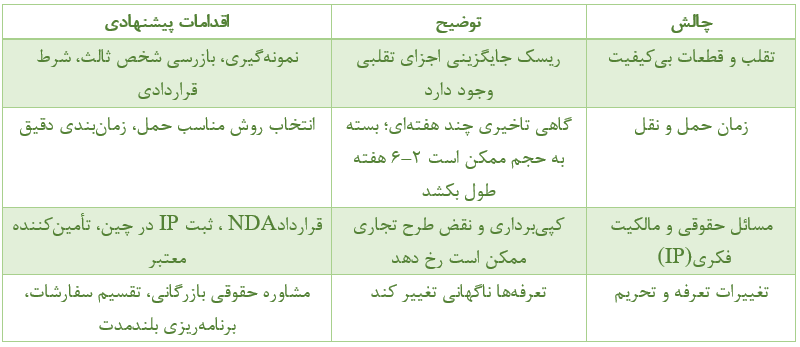 با وجود چالشهایی مثل کیفیت، ایپی و تاخیر، اما راهکارهای مدیریتی و شرکتهای تخصصی توانستهاند این چالشها را پوشش دهند و به همین دلیل در بسیاری از موارد، خرید از چین برای تولیدکننده یا توسعهدهنده، راهی سریع، منعطف و مقرونبهصرفه باقی میماند.