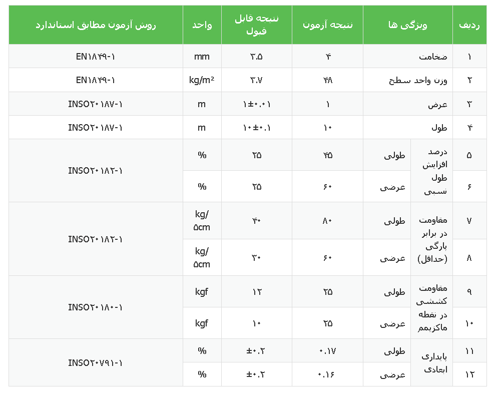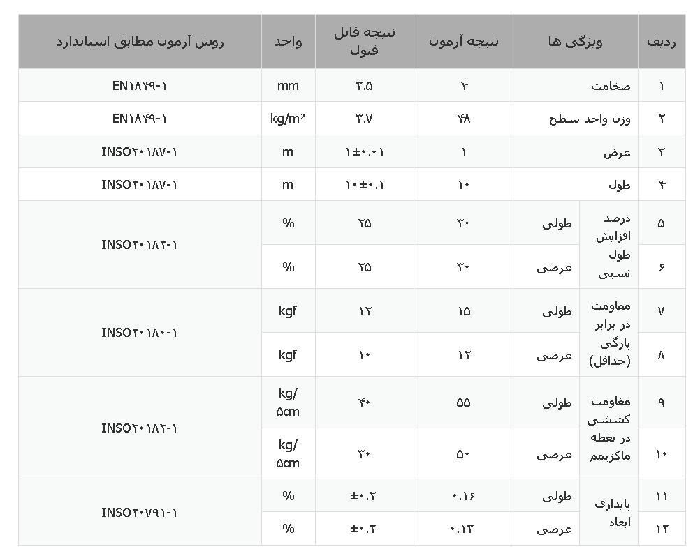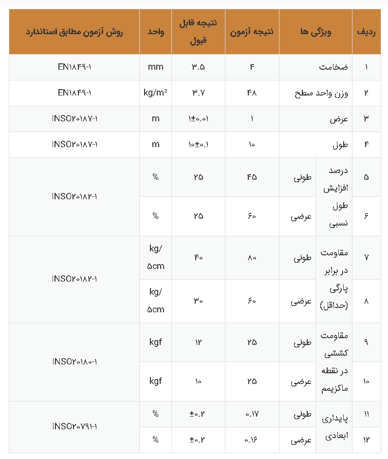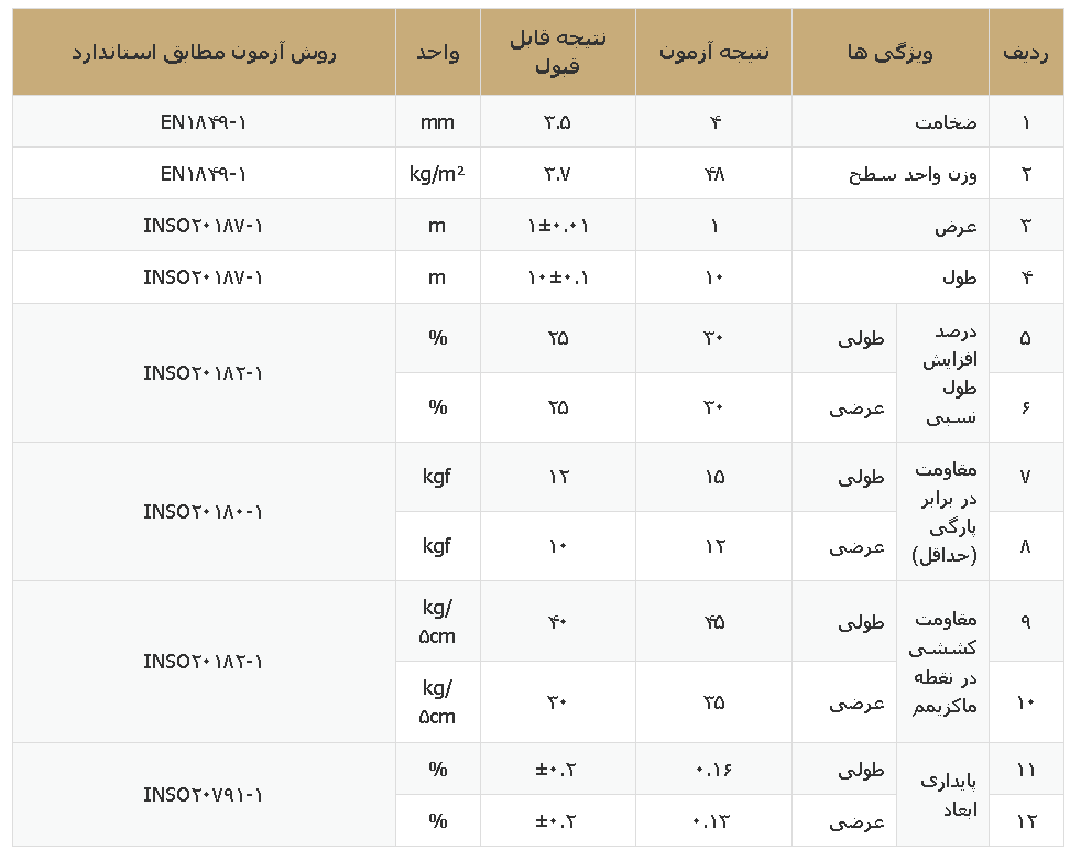 وزن و ضخامت: وزن هر رول حدود ۴۰ تا ۴۲ کیلوگرم و ضخامت آن ۴ میلیمتر ذکر شده است.