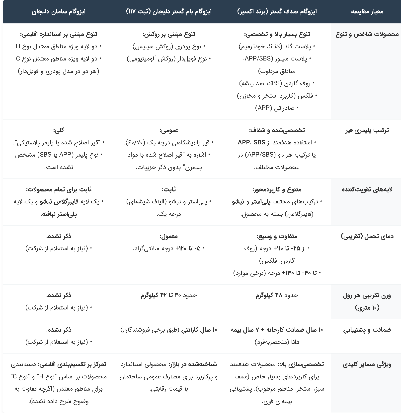 همانطور که در بررسی فنی سه برند معتبر ایزوگام صدف گستر، بام گستر و سامان دلیجان مشاهده شد، هر یک از این تولیدکنندگان با استراتژی و نقاط قوت متفاوتی در بازار حضور دارند. انتخاب «بهترین» محصول همواره به نیازهای خاص پروژه، شرایط اقلیمی محل اجرا و بودجه شما بستگی دارد.