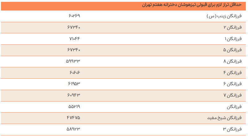 همچنین حداقل تراز لازم برای قبولی در مدارس فرزانگان استان تهران در سال گذشته نیز در جدول زیر درج شده است.