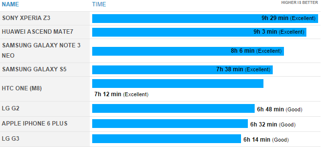 بر اساس نتایج بدست آمده در بین پرچمداران حال حاضر بازار، گوشی سونی Xperia Z3 بهترین باتری حال حاضر در بین گوشی های هوشمند را به خود اختصاص داده است؛ به بیان ساده تر شما با گوشی Xperia Z3 به طور میانگین می توانید به مدت ۹ ساعت و ۲۹ دقیقه کار کنید.