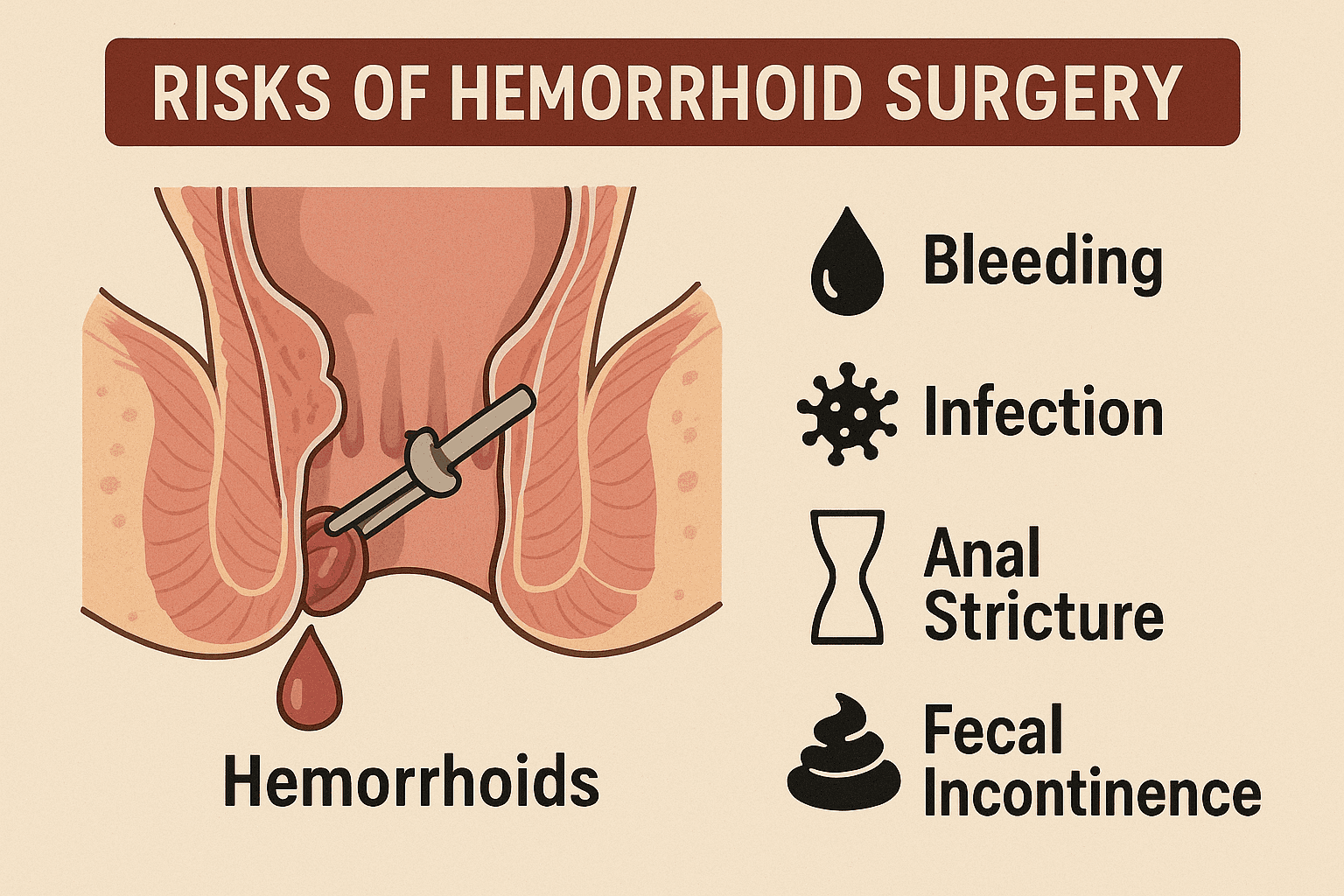 جراحی هموروئید با وجود اینکه برای درمان قطعی مفید است، اما بدون ریسک نیست. از جمله خطرات آن میتوان به خونریزی، عفونت، درد مزمن و بیاختیاری مدفوع اشاره کرد. همچنین در برخی موارد نادر، تنگی مقعد یا آسیب به اعصاب اطراف ممکن است رخ دهد. رعایت مراقبتهای پس از عمل نقش مهمی در کاهش این عوارض دارد.