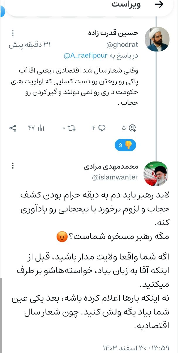 لابد رهبر باید دم به دیقه حرام بودن کشف حجاب و لزوم برخورد با بیحجابی رو یادآوری کنه.