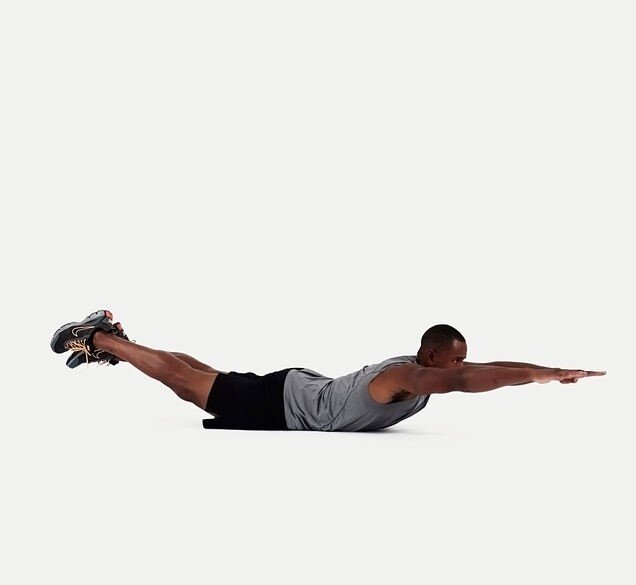 ۱. تمرین سوپرمن: به روی شکم بخوابید. دستها و پاها را در یک زمان به سمت بالا ببرید. برای این حرکت پس از بالا بردن پا و دست بدون زاویه دادن به آنها، دست و پای خود را رها نکنید و با کنترل به زمین برسانید. سه مرتبه و در هر مرتبه ۱۵ بار این کار را انجام دهید. اگر حرفهای هستید تعداد را بالاتر ببرید.