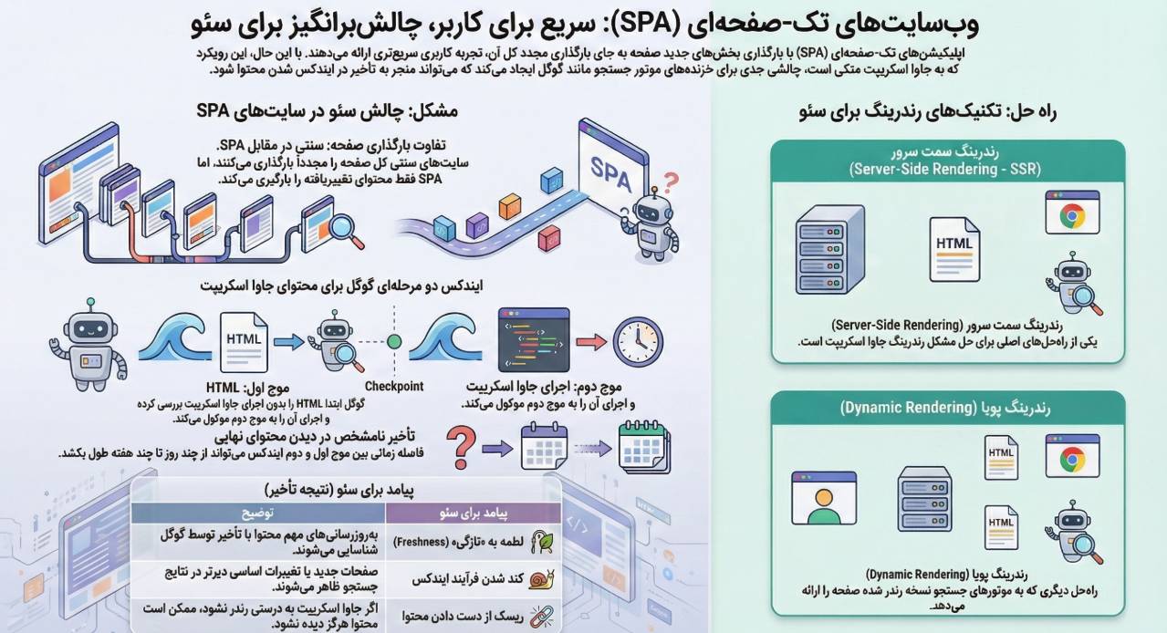 گوگل برای اینکه محتوای SPA رو بفهمه، معمولاً مجبور میشه صفحه رو رندر کنه (یعنی مثل مرورگر اجراش کنه). اینجا چند نکته مهم داریم: