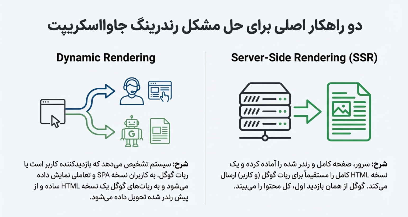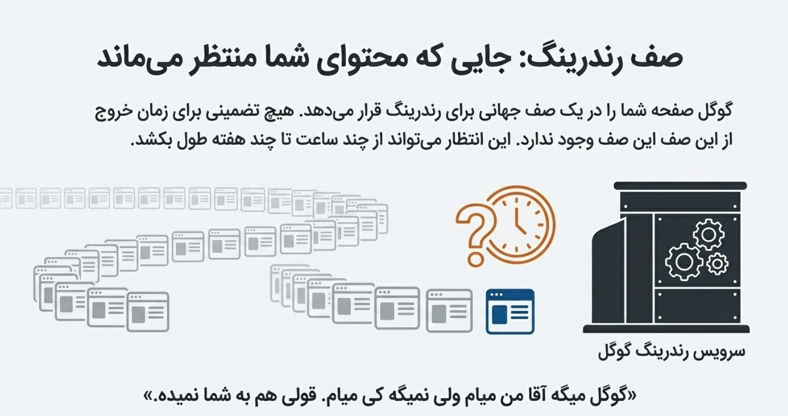 ولی اگر محتوای سئویی شما فقط بعد از JS و API دیده میشه، دارید روی «صف رندر گوگل» شرط میبندید؛ شرطی که زمانش دست شما نیست.