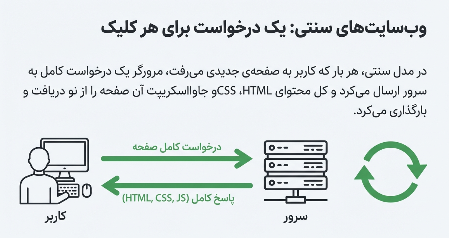 در مدل سنتی (Multi-page)، هر URL معمولاً یک HTML کامل از سرور میگیره. یعنی وقتی کاربر یا گوگل میره /product/123، سرور همون صفحه رو با محتوای اصلی تحویل میده.