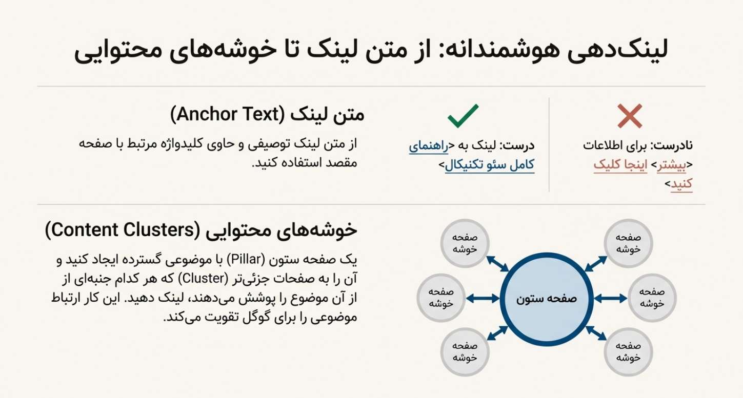 نکتهی مهم این است که لینکدهی داخلی باید هدفمند و مرتبط باشد. صرفاً ایجاد انبوهی از لینکهای تصادفی کمکی نمیکند؛ بلکه باید صفحات از لحاظ محتوایی به هم ارتباط داشته باشند تا لینکشدنشان منطقی باشد. یکی از روشهای موثر، تشکیل خوشههای محتوایی است: یک صفحه ستون (پیلار) که موضوع گستردهای را پوشش میدهد، و صفحات جزئیتری که هر کدام جنبهای از آن موضوع را توضیح میدهند. با لینک کردن صفحات خوشه به صفحه ستون و بالعکس، هم کاربر راحت به اطلاعات عمقیتر دسترسی مییابد و هم گوگل ارتباط موضوعی بین مطالب را متوجه میشود.