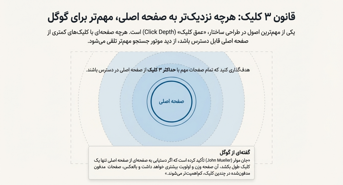 یکی از مهمترین اصول در طراحی ساختار سایت، قانون تعداد کلیکها است: هرچه صفحهای به صفحه اصلی نزدیکتر باشد (تعداد کلیک کمتری نیاز داشته باشد)، از دیدگاه موتور جستجو مهمتر تلقی میشود. گوگل صراحتاً توصیه میکند که صفحات مهم سایت تنها با چند کلیک منطقی از صفحه نخست قابل دسترسی باشند. بسیاری از متخصصان سئو پیشنهاد میکنند که حداکثر عمق برای رسیدن به یک صفحه، حدود 3 کلیک باشد. به عنوان مثال، John Mueller از تیم گوگل تأکید کرده است که اگر دستیابی به صفحهای از صفحه اصلی تنها یک کلیک طول بکشد، آن صفحه وزن و اولویت بیشتری در نتایج خواهد داشت و بالعکس، صفحات مدفونشده در چندین کلیک، از نظر گوگل کماهمیتتر میشوند.