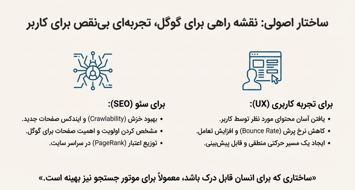 از دید تجربه کاربری نیز، یک ساختار منطقی باعث میشود کاربر به راحتی موضوعات مورد نظرش را پیدا کند و بین صفحات مرتبط جابجا شود. اگر کاربران برای یافتن مطلب دلخواه مجبور باشند مسیر پیچیدهای را طی کنند یا منوی نامفهومی را مرور کنند، احتمالأ سایت را ترک میکنند. همین مسئله برای گوگل هم صادق است – اگر بازدیدکنندهی انسانی نتواند به سادگی به بخشی از سایت برسد، خزنده گوگل نیز ممکن است دچار مشکل شود. پس ساختاری که برای انسان قابل درک باشد، معمولاً برای موتور جستجو نیز بهینه است.