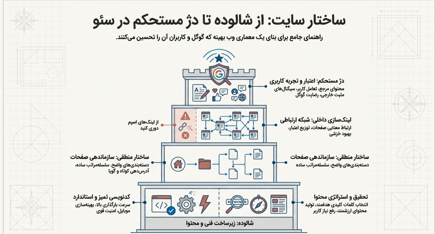 ساختار سایت مانند اسکلت یک ساختمان است که تمام بخشهای دیگر بر روی آن سوار میشوند. یک ساختار سایت برنامهریزیشده و منظم، پایهایترین گام برای موفقیت در سئو است. اگر چینش صفحات سایت شما منطقی و هرمی نباشد، نه تنها کاربران در پیدا کردن محتوا سردرگم میشوند، بلکه موتورهای جستجو (مثل گوگل) نیز نمیتوانند درک درستی از سایت شما داشته باشند. به بیان ساده، ساختار ضعیف = سردرگمی کاربر و موتور جستجو. در مقابل، یک ساختار عالی باعث میشود تمام صفحات مهم سایت بهراحتی قابل دستیابی بوده و ارتباط معنایی بین آنها مشخص باشد. در این مقالهی جامع، به صورت کاملاً تخصصی به مبحث ساختار سایت و لینکدهی داخلی میپردازیم. ابتدا اهمیت ساختار سایت در سئو را بررسی میکنیم، سپس اصول طراحی یک ساختار هرمی بهینه را توضیح میدهیم. در ادامه دربارهی لینکدهی داخلی صحیح، جلوگیری از وجود صفحات یتیم، طراحی منوی ناوبری روشن و استفاده از بردکرامب (breadcrumb) صحبت میکنیم. همچنین مفهوم عمق کلیک (Click Depth) – این قانون که هر صفحهی مهم باید با چند کلیک منطقی قابل دسترسی باشد – را تشریح کرده و به منابع معتبر گوگل در این زمینه استناد خواهیم کرد. با اجرای نکات و ترفندهای ارائهشده، میتوانید ساختار سایت خود را به گونهای بهبود دهید که هم برای کاربران قابل فهم باشد و هم برای موتورهای جستجو بهینه.