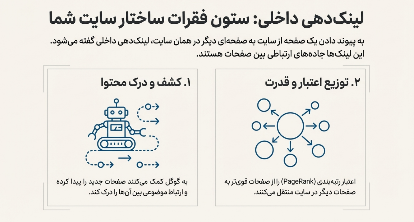 لینکدهی داخلی (Internal Linking) به پیوند دادن یک صفحه از سایت به صفحهای دیگر در همان سایت گفته میشود. این لینکها ممکن است در منوی سایت، بخش فوتر، یا داخل محتوای صفحه قرار داشته باشند. لینکهای داخلی ستون فقرات ساختار سایت هستند و نقش جادههای ارتباطی بین صفحات را بازی میکنند. از دید سئو، لینکهای داخلی دو فایده بزرگ دارند: کمک به خزش و کشف صفحات توسط موتور جستجو و توزیع اعتبار و اهمیت بین صفحات مختلف.