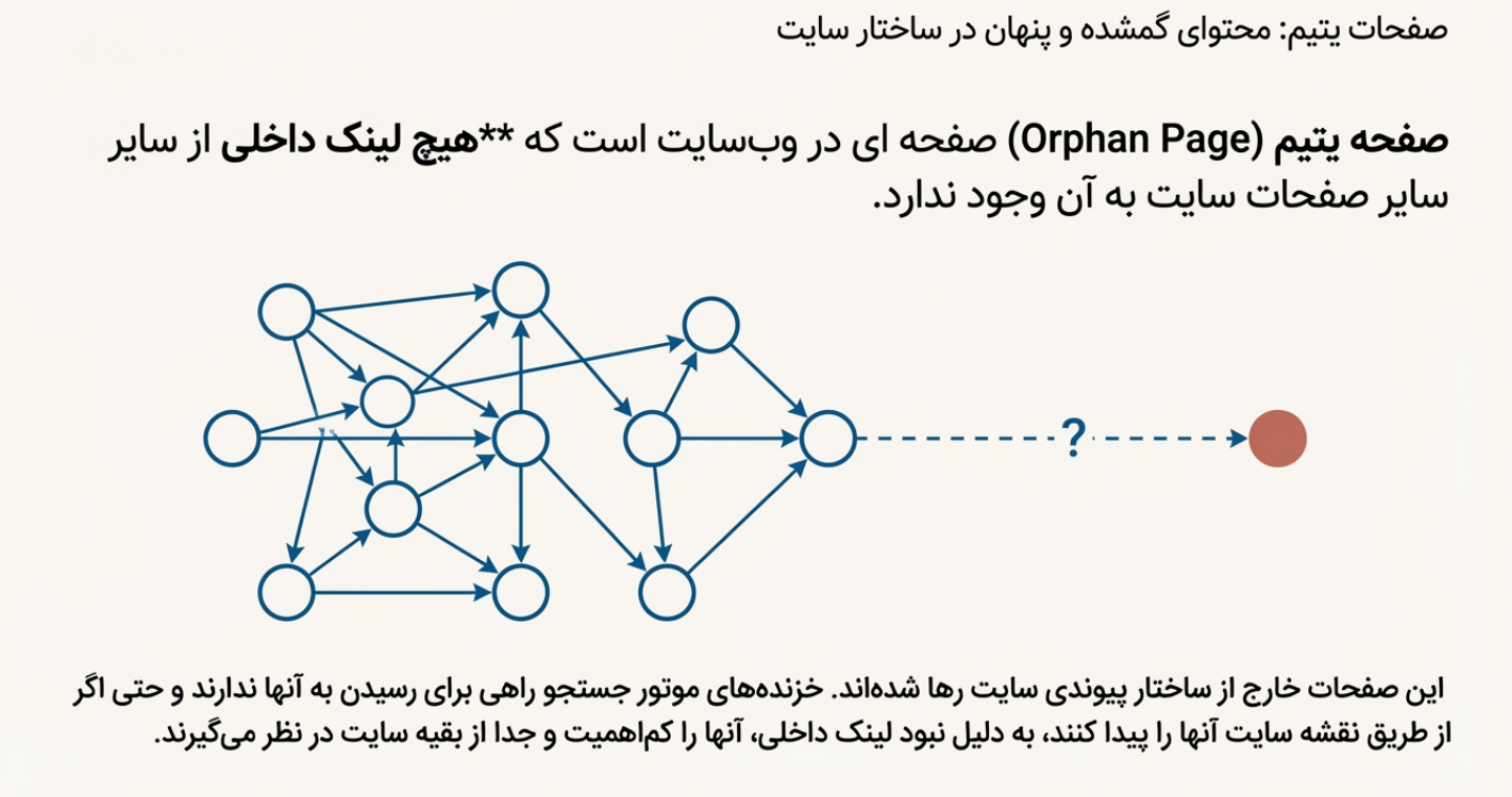 صفحه یتیم (Orphan Page) صفحهای در وبسایت است که هیچ لینک داخلی از سایر صفحات سایت به آن وجود ندارد. چنین صفحهای خارج از ساختار پیوندی سایت رها شده و خزندههای موتور جستجو به طور معمول راهی برای رسیدن به آن ندارند. اگر گوگل از طریق سایتمپ XML یا لینکهای خارجی از وجود این صفحه مطلع شود هم، به دلیل نبود لینک داخلی، آن را جدا از بقیه سایت میبیند و در اولویت پایینی قرار میدهد. در نتیجه احتمال ایندکس نشدن یا حذفشدن این صفحات از نتایج جستجو بسیار زیاد است.