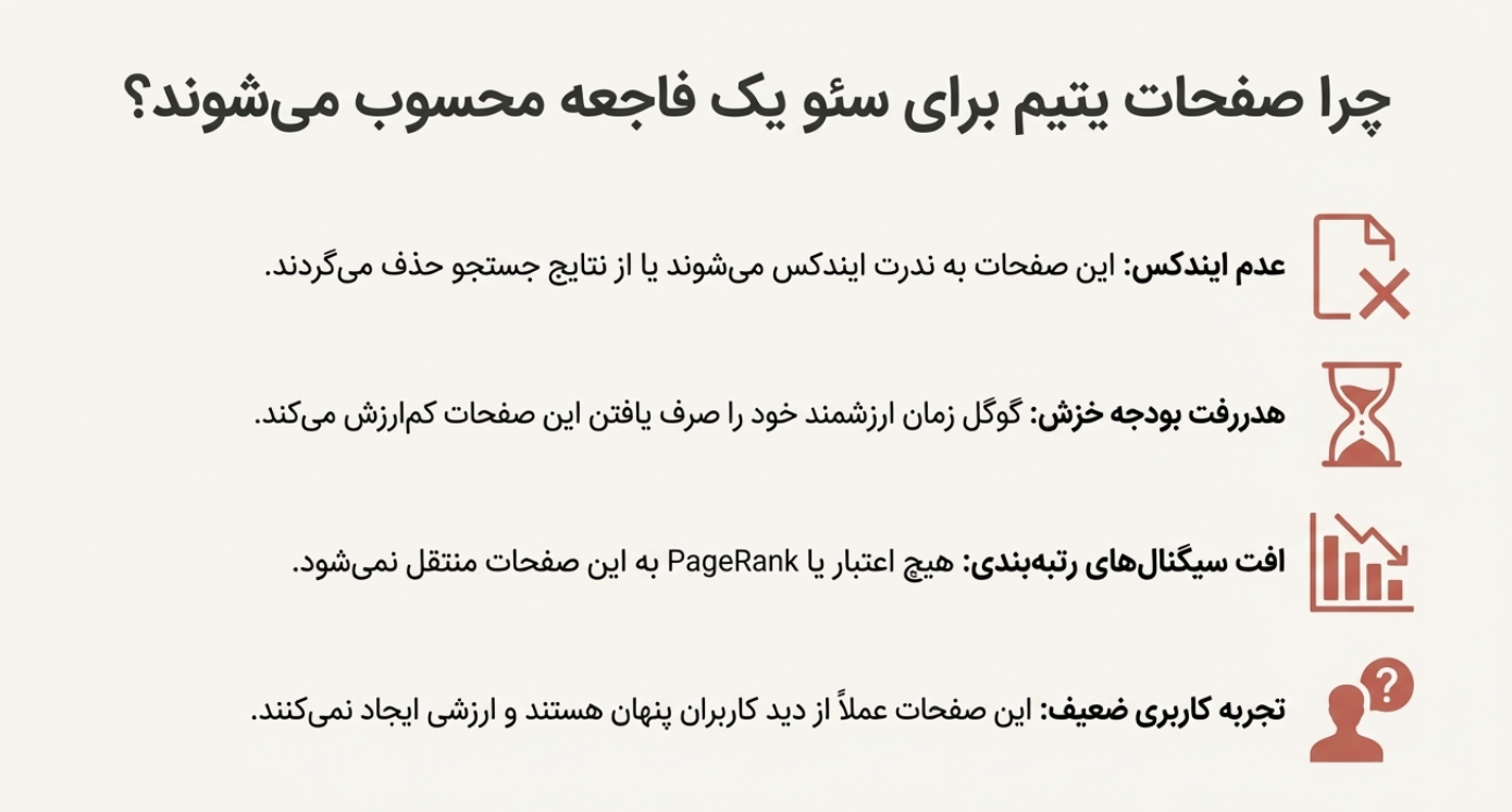 هدررفت بودجه خزش: وجود تعداد زیادی صفحهی یتیم میتواند بودجهی خزیدن (crawl budget) سایت را هدر دهد، زیرا گوگلbot ممکن است زمان خود را صرف یافتن و خزش این صفحات کمارزش کند در حالی که میتوانست صفحات مهمتر را عمیقتر بخزد.