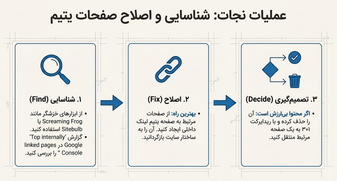 جلوگیری از صفحات یتیم: هیچ صفحه مفیدی را بدون لینک رها نکنید. به صورت دورهای ساختار لینکهای خود را بازبینی کنید و در صورت وجود صفحات یتیم، با افزودن لینک یا انتقال آنها مشکل را برطرف نمایید.