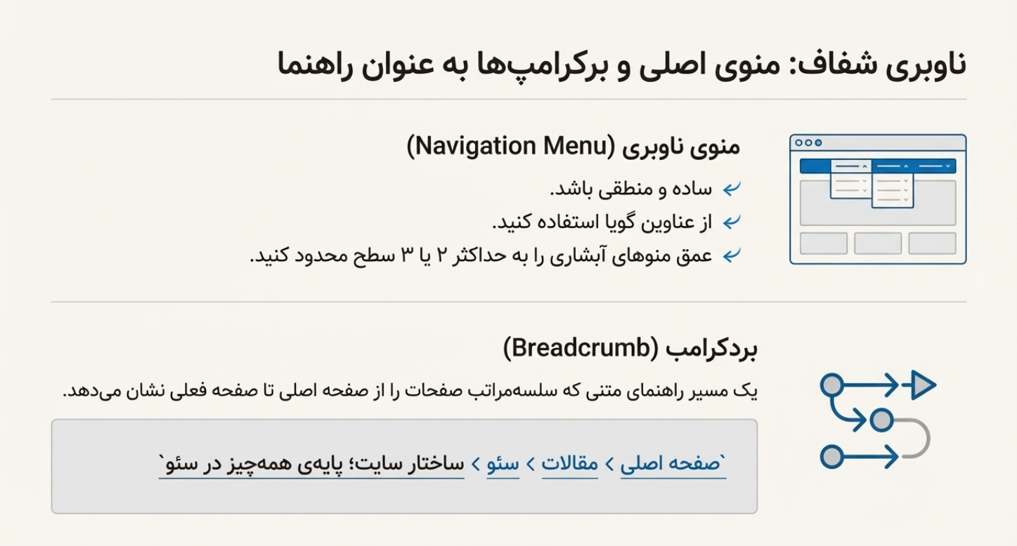 ناوبری و بردکرامب شفاف: منوی سایت را ساده و قابل فهم طراحی کنید. از بردکرامب برای نمایش مسیر کاربر استفاده کنید تا هم تجربه کاربری بهبود یابد و هم ساختار سایت برای گوگل روشنتر شود.
