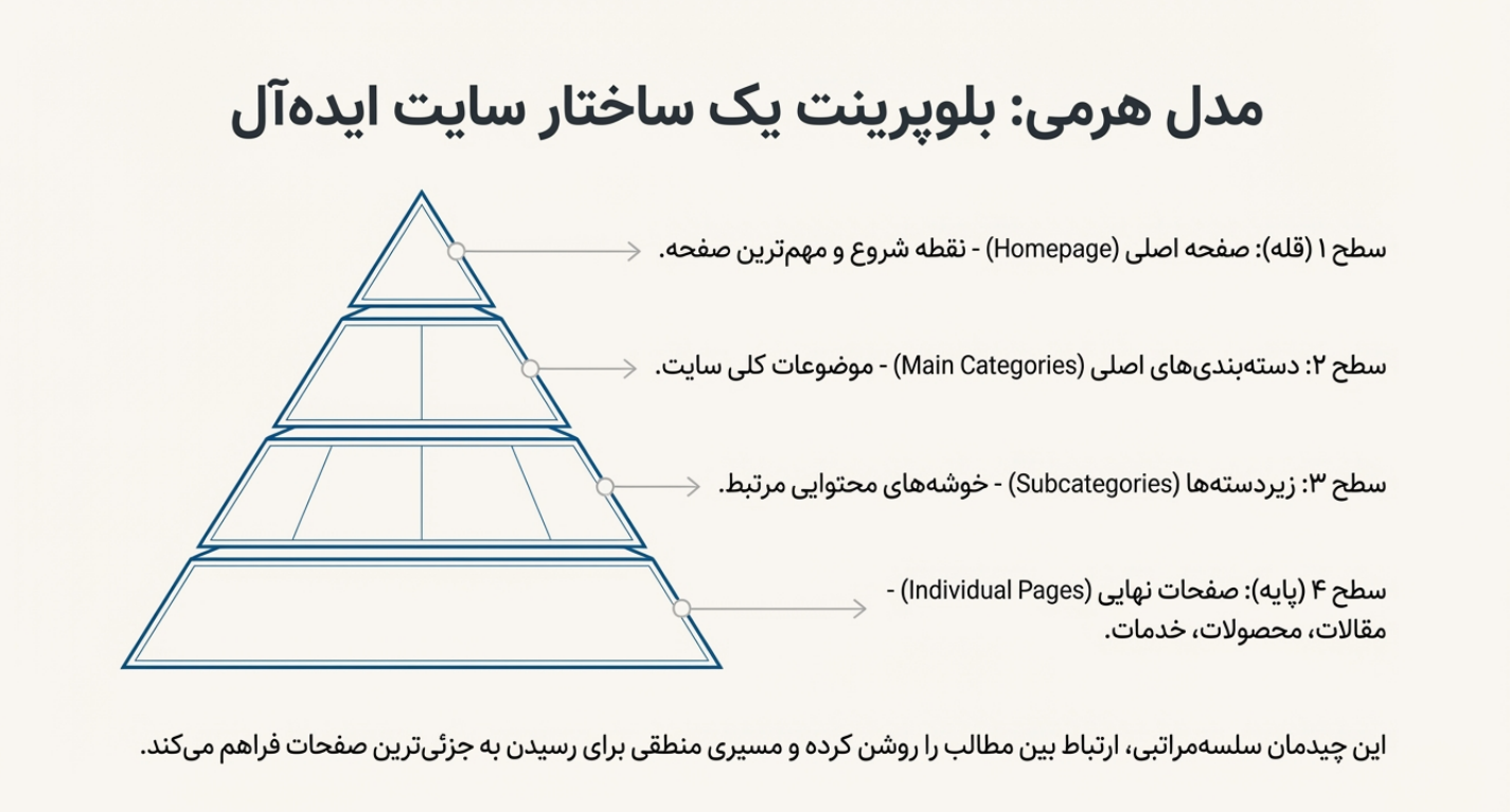 ساختار هرمی و سلسلهمراتبی: محتوای سایت را به شکل یک هرم سازماندهی کنید؛ صفحات اصلی در بالا و جزئیات در پایین. مطمئن شوید هر صفحه مهم با حداکثر 3 کلیک از صفحه اصلی قابل دسترسی است.