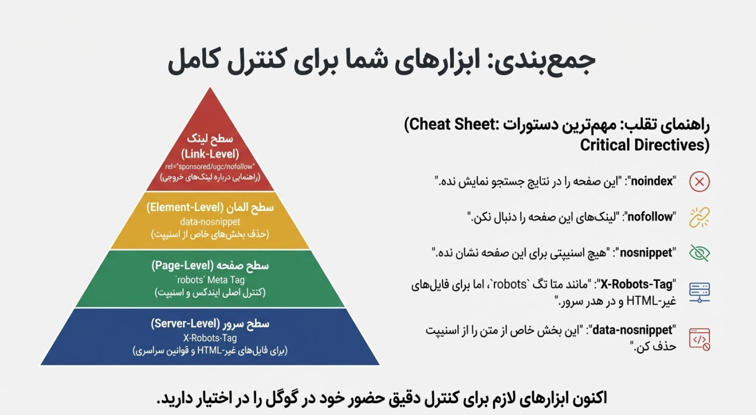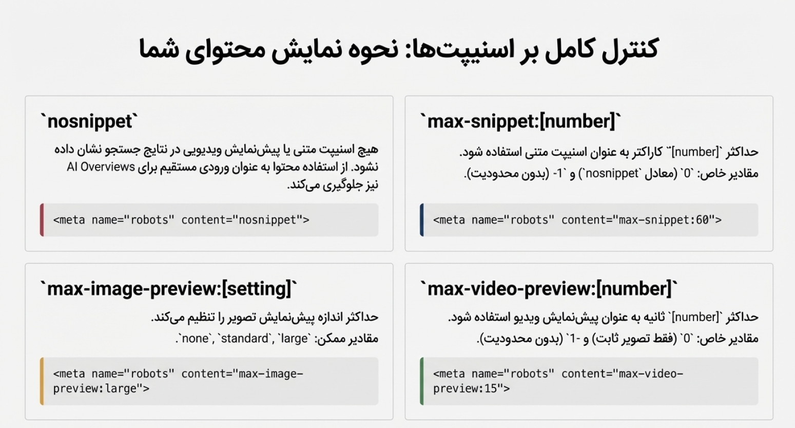 گاهی حتی لازم داری یک صفحه دیده بشه ولی اسنیپتش نمایش داده نشه، یا مثلاً فایل PDF رو از نتایج حذف کنی، یا بخشی از متن (مثل قیمت، کد تخفیف، یا توضیح حساس) توی اسنیپت گوگل نمایش داده نشه.