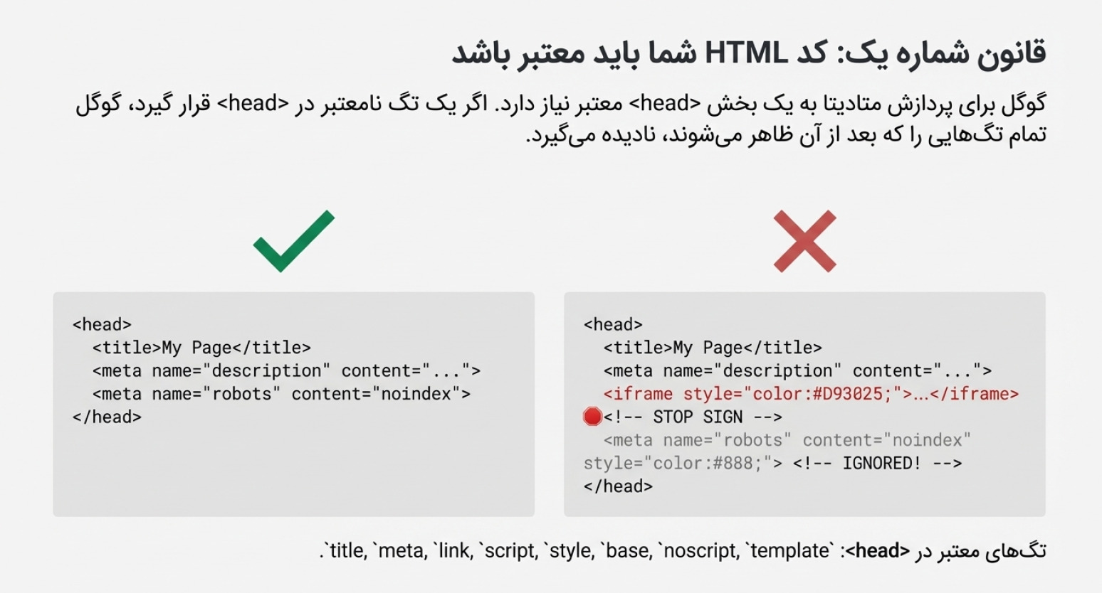 اگر داخل <head> چیزی بذاری که اونجا «مجاز نیست» (مثل img یا iframe) ممکنه گوگل برداشت کنه که head تموم شده و تگهای بعدی رو نخونه. یعنی ممکنه robots یا description یا هر متای مهم دیگهای نادیده گرفته بشه.