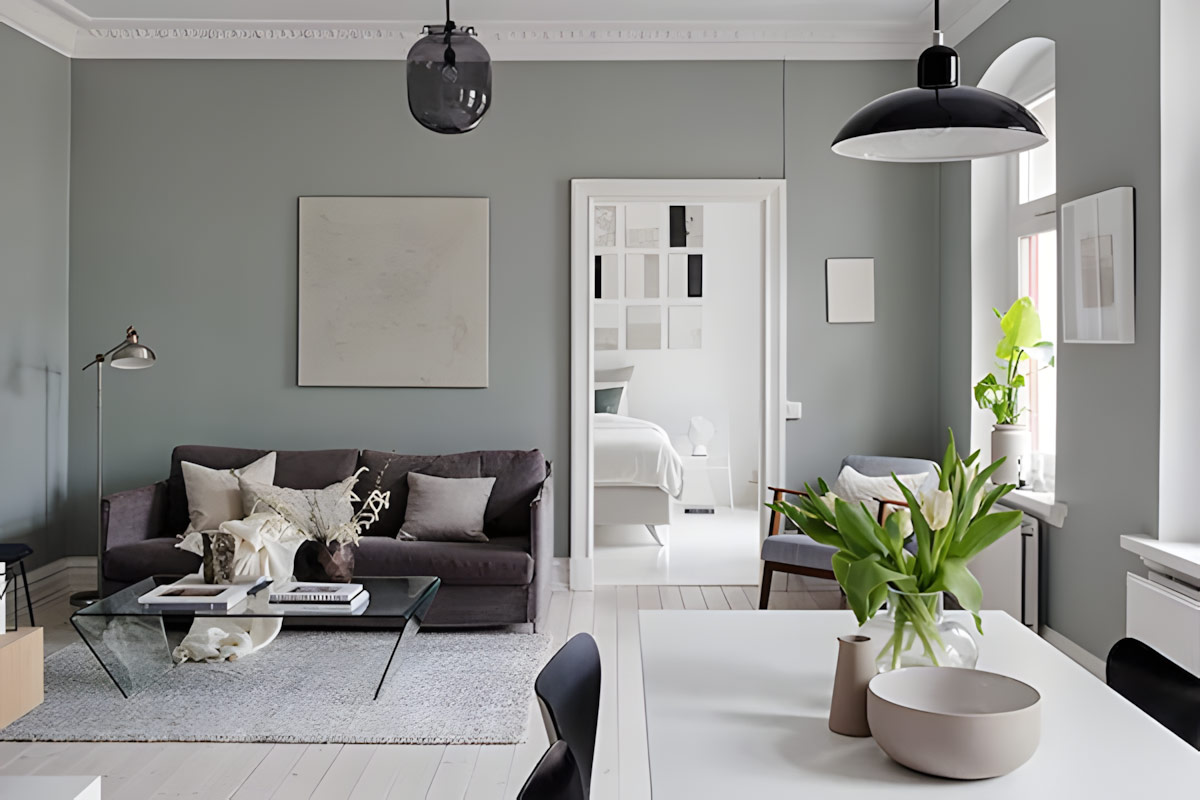 با استفاده از رنگهای مینیمالیستی تیرهتر مانند خاکستری یا خاکستری تیره برای یک دیوار خاص، میتوانید کنتراست ایجاد کرده و فضا را از یکنواختی درآورید.