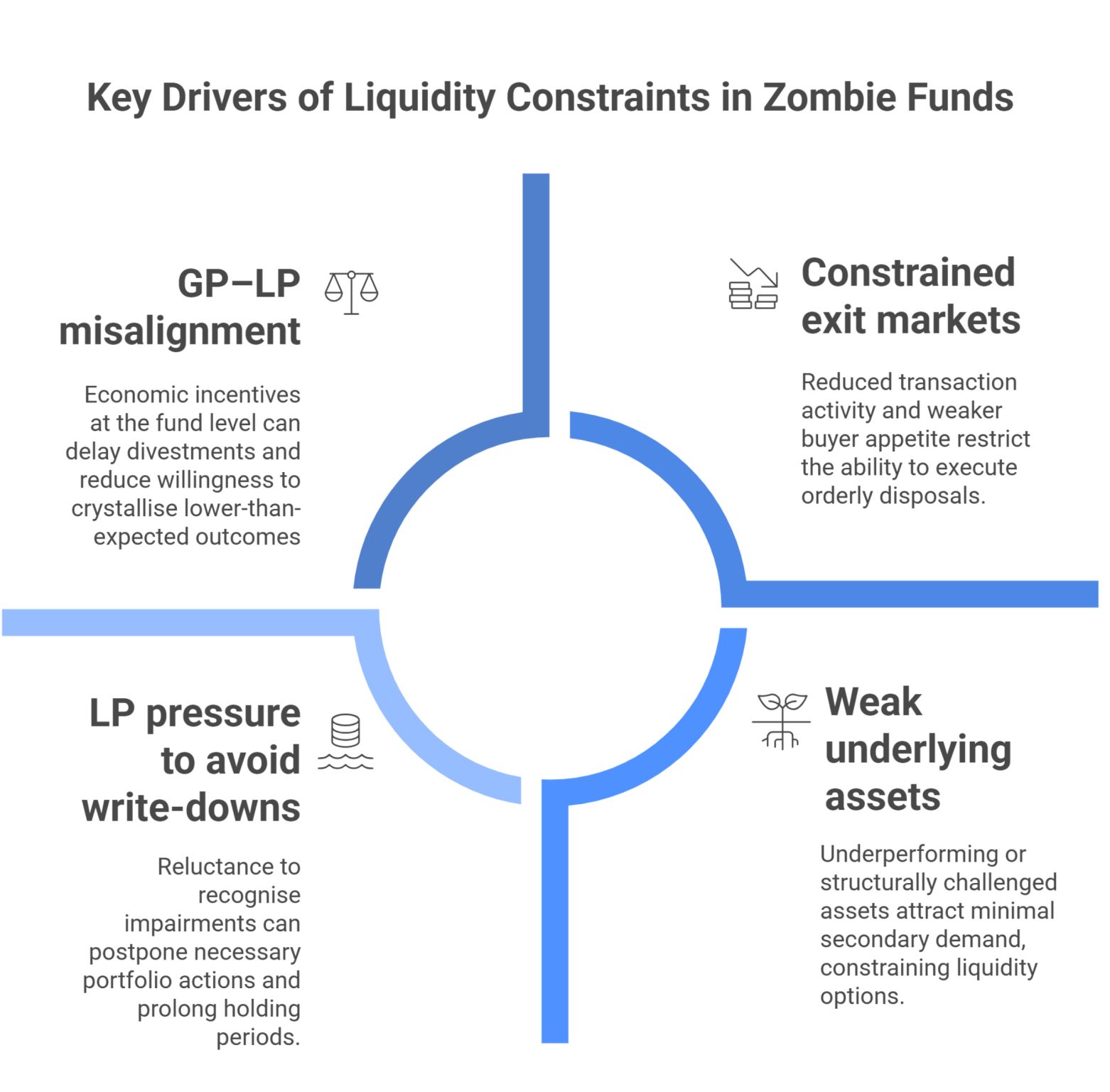 داراییهای ضعیف بازار خروج را محدود میکنند، بازار محدود فروش را به تعویق میاندازد، تعویق فروش IRR را کاهش میدهد و کاهش بازده، مقاومت در برابر شناسایی زیان را تشدید میکند. نتیجه، صندوقی است که از نظر حقوقی زنده است اما از نظر اقتصادی پویایی خود را از دست داده است.