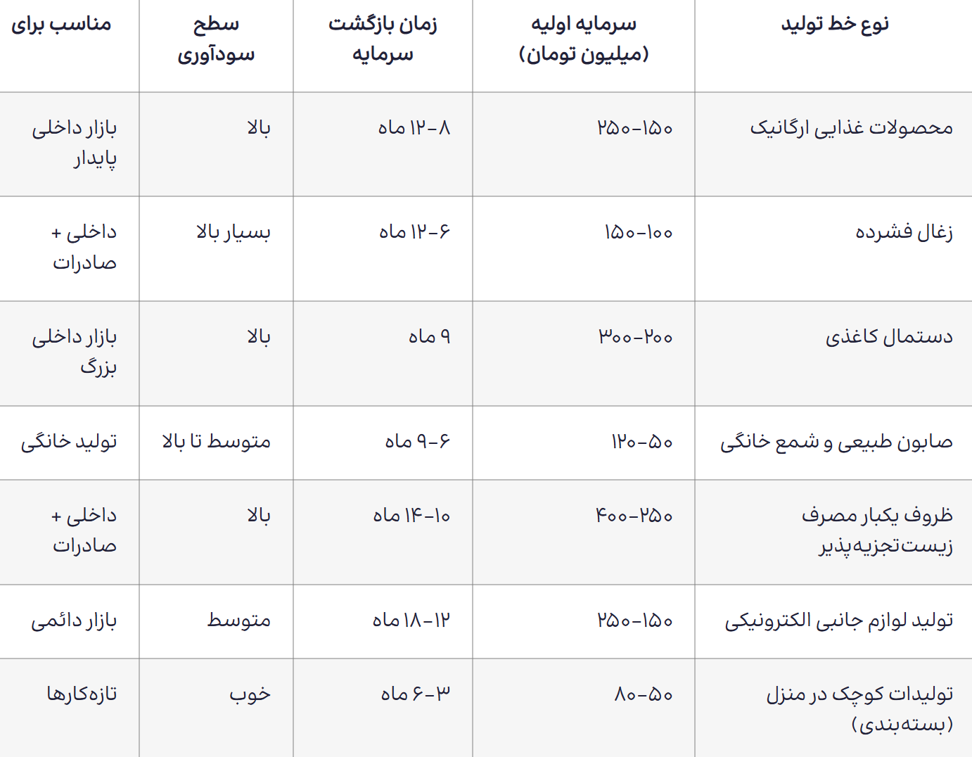 راهاندازی یک خط تولید پرسود در ایران با سرمایه اولیه محدود، کاملاً امکانپذیر است. چه به دنبال یک خط تولید خانگی کوچک ولی پردرآمد باشید و چه بخواهید در مقیاس بزرگتر فعالیت کنید، فرصتهای متنوعی پیش روی شماست.