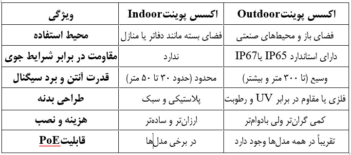 👉 خرید اکسس پوینت Outdoor را مشاهده کنید تا بتوانید بر اساس نیاز محیط، بهترین مدل را انتخاب نمایید.