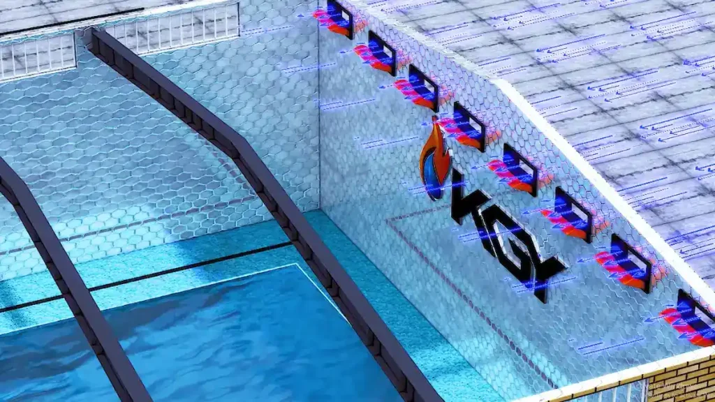 در فصل زمستان، این سیستم مزیت مهمی دارد. هوای سرد ورودی از دریچه اینلت استخر در لایههای بالایی سالن باقی مانده و با تماس با هوای گرم، جابجایی طبیعی ایجاد میشود. این فرایند دمای سطح استخر را افزایش داده و محیطی گرم و مطلوب برای شناگران فراهم میکند، ضمن اینکه مصرف انرژی را کاهش میدهد. برای تهویه سالنهای با عرض بیشتر از 50 متر، استفاده از این سیستم توصیه میشود.