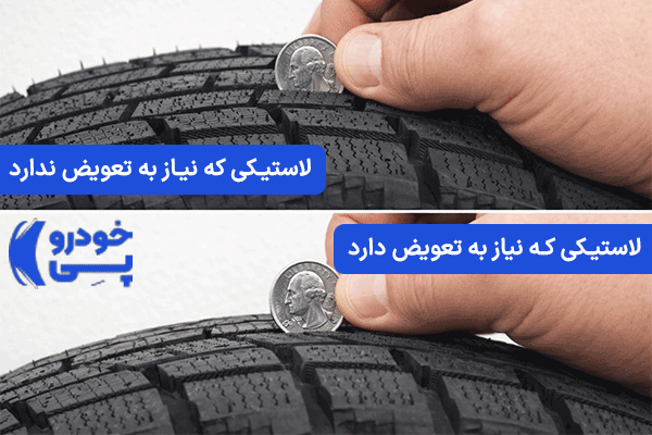 ۳. تست سکه: یک روش ساده برای بررسی عمق آج لاستیک این است که یک سکه را بین شیارهای لاستیک قرار دهید، اگر بخش کمی از آن پوشیده شد، عمق آج کم شده و باید لاستیک را تعویض کنید.