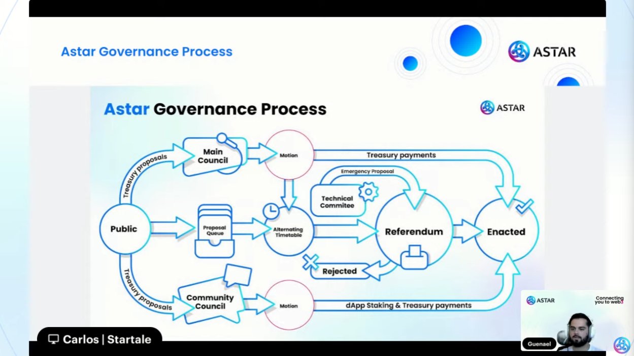 در حدود ۳۰۰ میلیون توکن ASTR به صورت «روی زنجیره» وجود دارد. شورای اصلی میتواند تا سقف ۱ میلیون ASTR را تأیید کند؛ مبالغ بالاتر از آن به همهپرسی عمومی نیاز دارند. طی کمتر از یک سال، حدود ۴۳ طرح و ۴۳ همهپرسی انجام شده که نشاندهنده فعالیت بسیار بالای حاکمیت است.