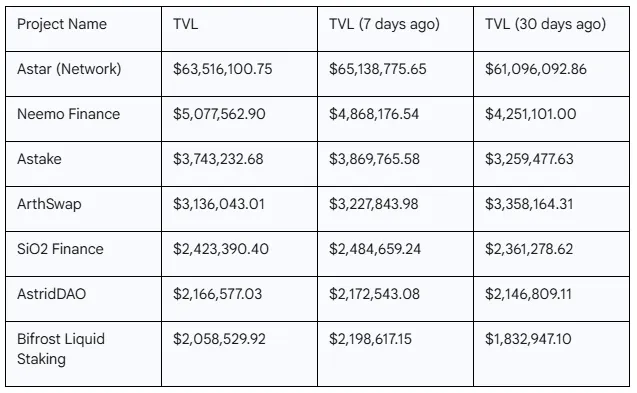 اکوسیستم آستار دارای طیف متنوعی از dApps، عمدتاً در فضاهای دیفای، بازی و NFT است. پروژههای برجسته شامل Algem، Neemo Finance، ArthSwap و AstridDAO هستند. مجموع ارزش قفل شده (TVL) در شبکه آستار یک شاخص کلیدی سلامت آن است، به طوری که TVL در حدود ۶۳.۵ میلیون دلار در نوسان است.