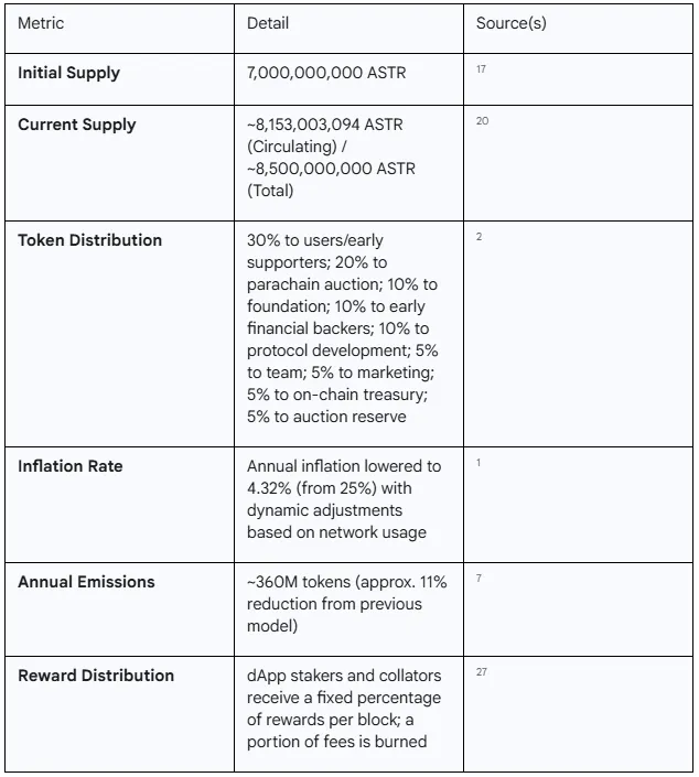 ASTR تحت یک مدل توکنومیک تورمی با عرضه اولیه ۷ میلیارد واحد و بدون حداکثر عرضه محدود فعالیت میکند. شبکه با هر بلاک، توکنهای ASTR جدیدی را برای تأمین مالی سیستمهای پاداش خود منتشر میکند. این مدل تورمی یک حوزه کلیدی تمرکز استراتژیک بوده و چندین بازنگری را برای بهینهسازی پایداری بلندمدت خود پشت سر گذاشته است. نرخ تورم سالانه اصلی تقریباً ۱۰٪ بود، اما به روزرسانیهای اخیر این نرخ را به حدود ۶۶۵ میلیون ASTR در سال کاهش داده است. تغییرات اخیرتر، به ویژه در آوریل ۲۰۲۵، نرخ تورم سالانه را به ۴.۳۲٪ کاهش داد و انتشارات را به استفاده از شبکه مرتبط کرد، با سوزاندن بخشی از کارمزدهای تراکنش برای جبران تورم. ارتقاء Asynchronous Backing، که زمان بلاک شبکه را به نصف کاهش داد، انتشار ASTR در هر بلاک را نیز ۵۰٪ کاهش داد، بدون اینکه نرخ تورم سالانه کلی را تغییر دهد، بنابراین کارایی را بهبود بخشید و فشار فروش را کاهش داد.