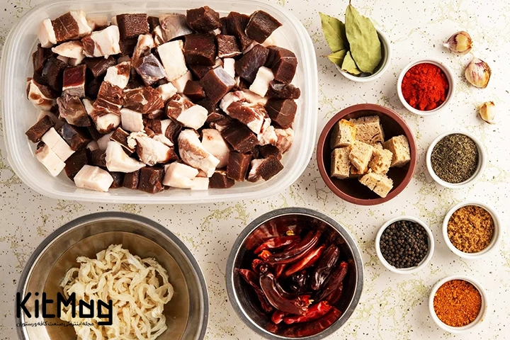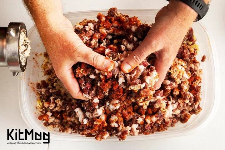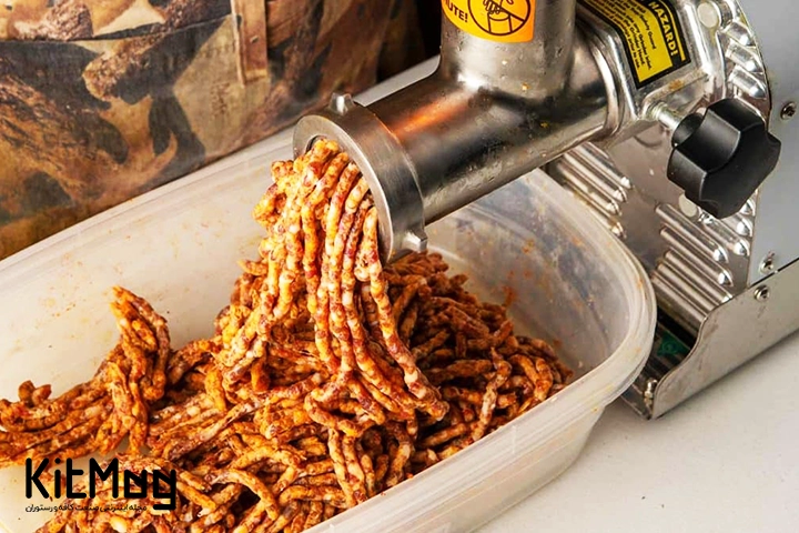 پس از آماده سازی، مخلوط گوشت و ادویه را در محفظه دستگاه سوسیسپرکن بریزید.