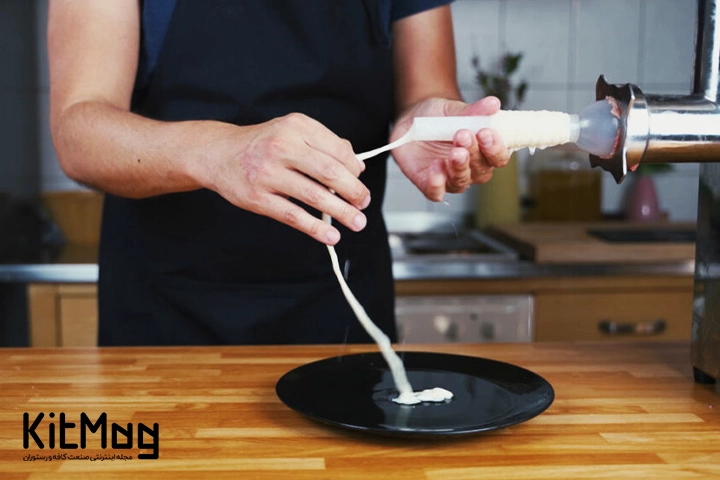 با یک دست خروجی قیف را تنظیم کنید تا روکش بدون حباب روی گوشت قرار گیرد و با دست دیگر، سوسیسها را بهصورت منظم روی میز یا تخته کار قرار دهید.
