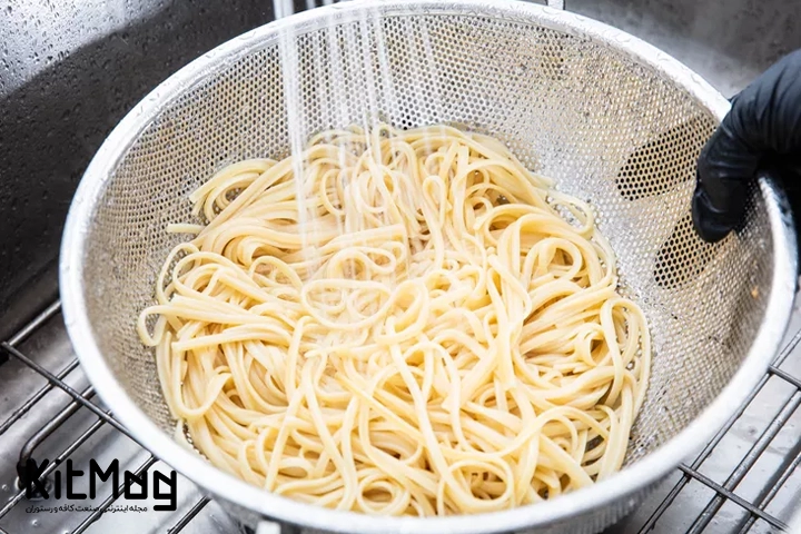 نشاستهٔ روی پاستا که باعث میشود سس بچسبد، شسته میشود.