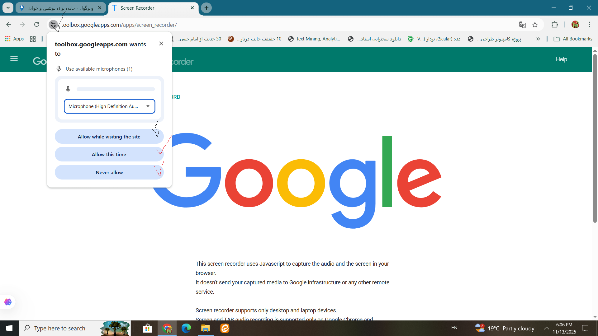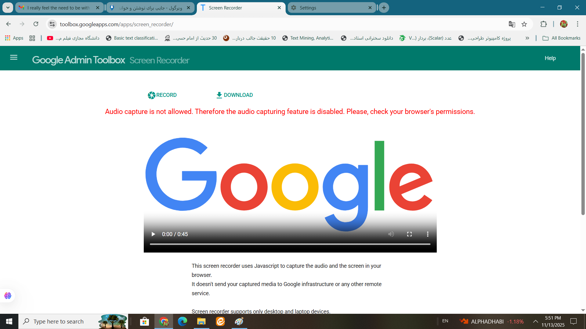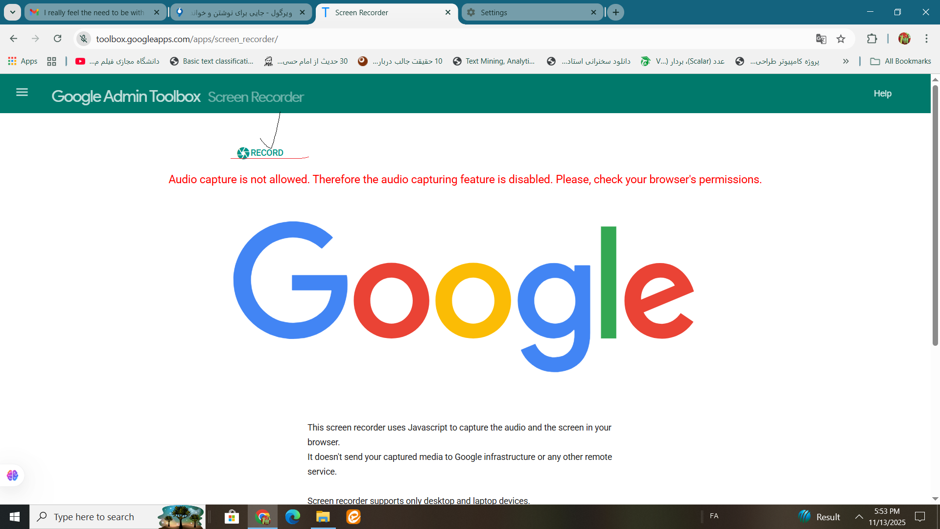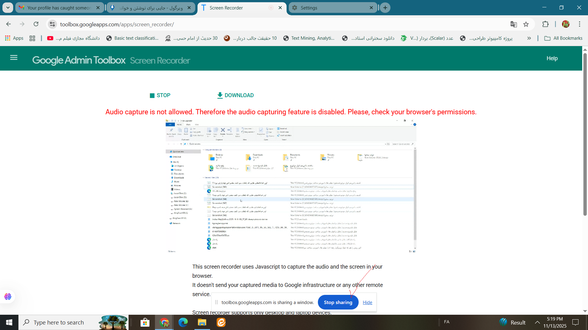 اسکرین یا ضبط کننده و تب یا قسمت صدا ضبط می کند درحال پشتیبانی است فقط روی گوگل کروم و کرومیوم برمبنای مرورگرتان.