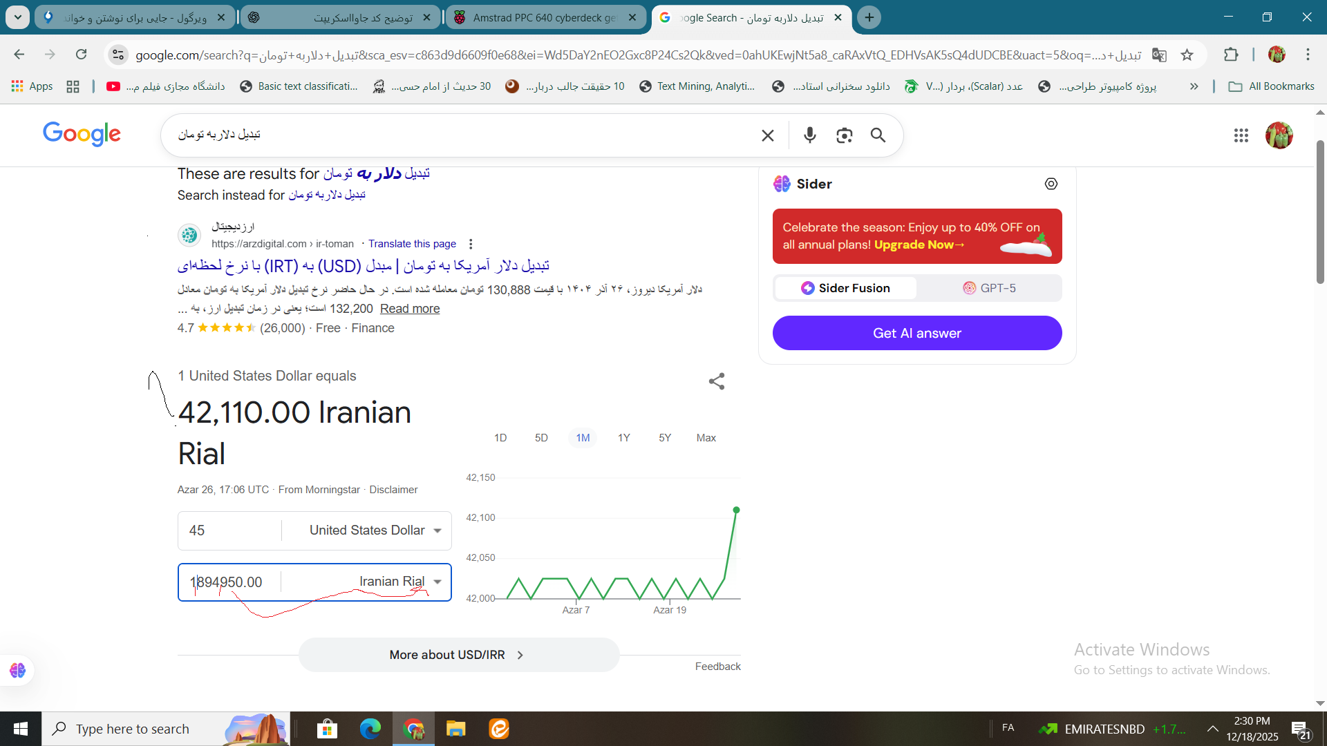 ✅ نرخ بازار آزاد ایران: حدود ۵۸,۵۰۰,۰۰۰ ریال برای ۴۵ دلار. Alan Chandاگر بخواهی میتوانم دقیقتر با نرخ امروز دلار به تومان محاسبه کنم (بر اساس صرافی یا قیمت بازار آزاد). فقط بگو!