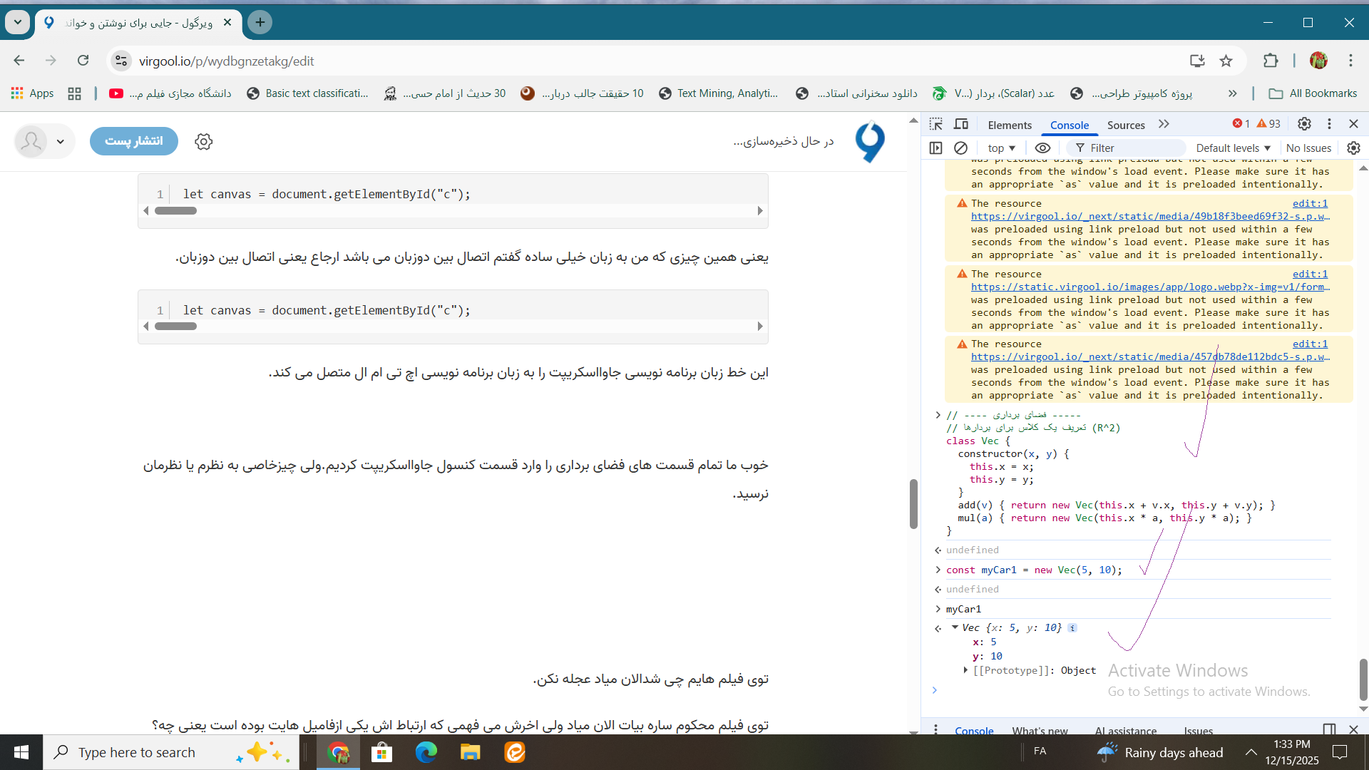 خوب ما تمام قسمت های فضای برداری را وارد قسمت کنسول جاوااسکریپت کردیم.ولی چیزخاصی به نظرم یا نظرمان نرسید.