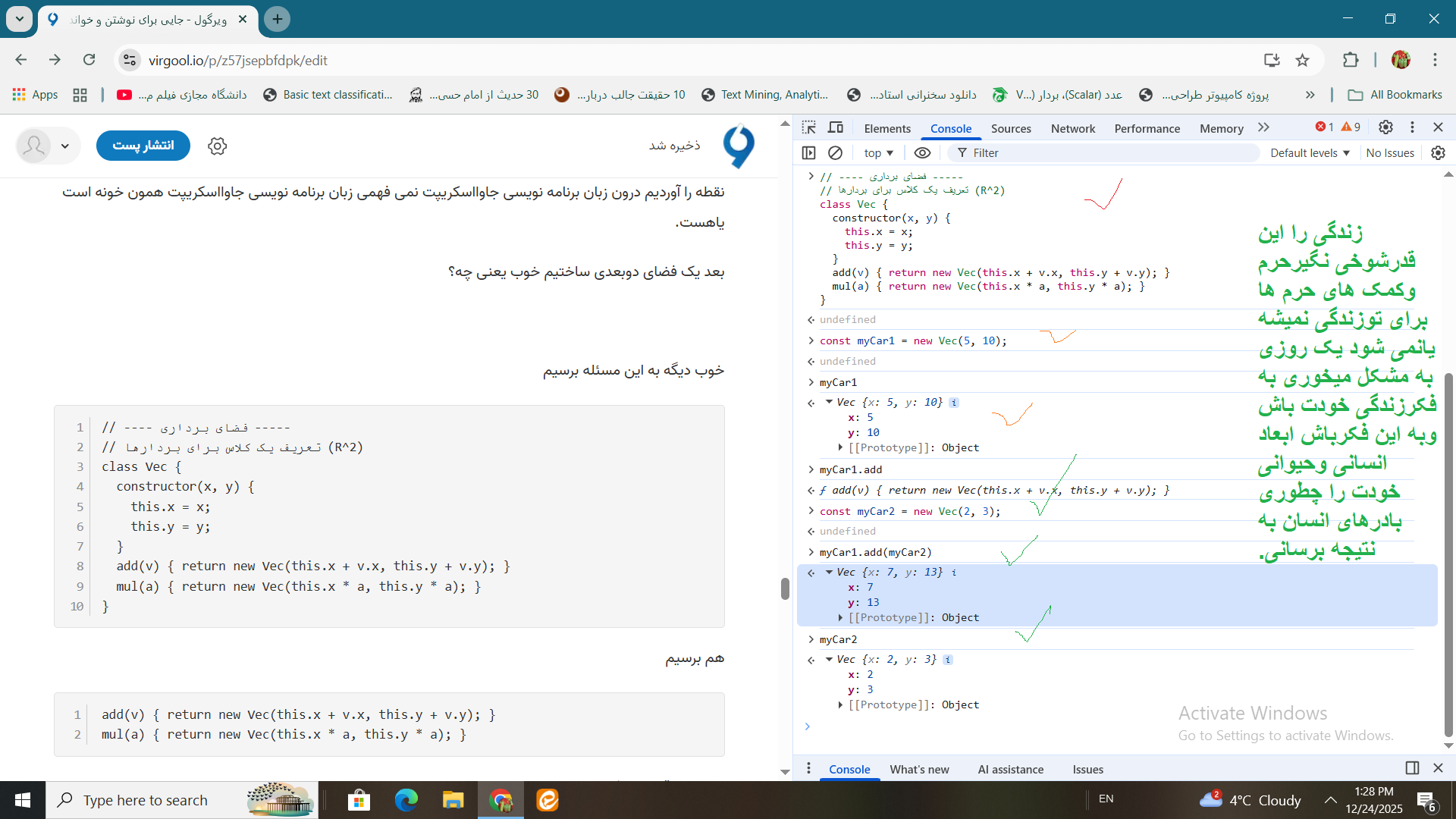 // ---- فضای برداری ----- // تعریف یک کلاس برای بردارها (R^2) class Vec { constructor(x, y) { this.x = x; this.y = y; }