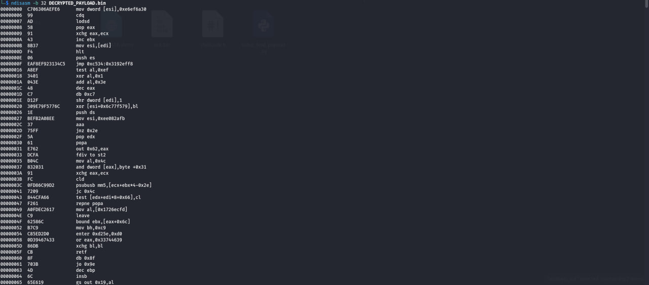 بعدش دوباره دستور file رو زدم و فایل نهایی همچنان توسط سیستم به عنوان data شناخته میشد. این من رو به سمت فرضیه شلکد خام هدایت کرد.با استفاده از دیساسمبلر ndisasm، فایل را به زبان اسمبلی ۳۲ بیتی ترجمه کردیم.